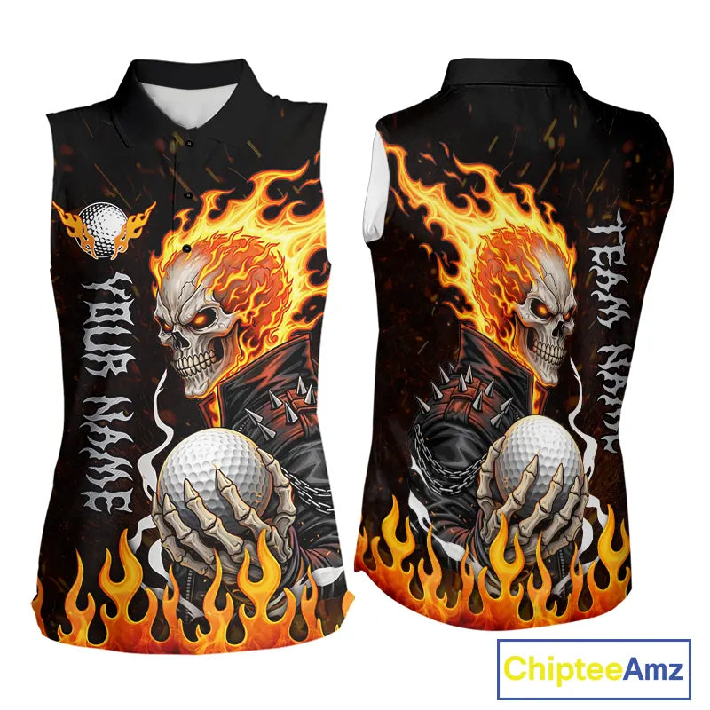 Custom Orange Flame Skull sleeveless women's golf shirts, team ladies golf tees cool golf gifts NQS11497