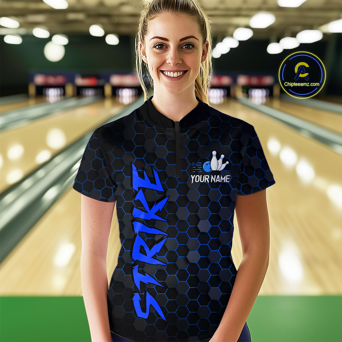 Custom Strike Blue Bowling Women Bowling Shirt Polo & Quarter-Zip Bowling Team Jerseys HNT79