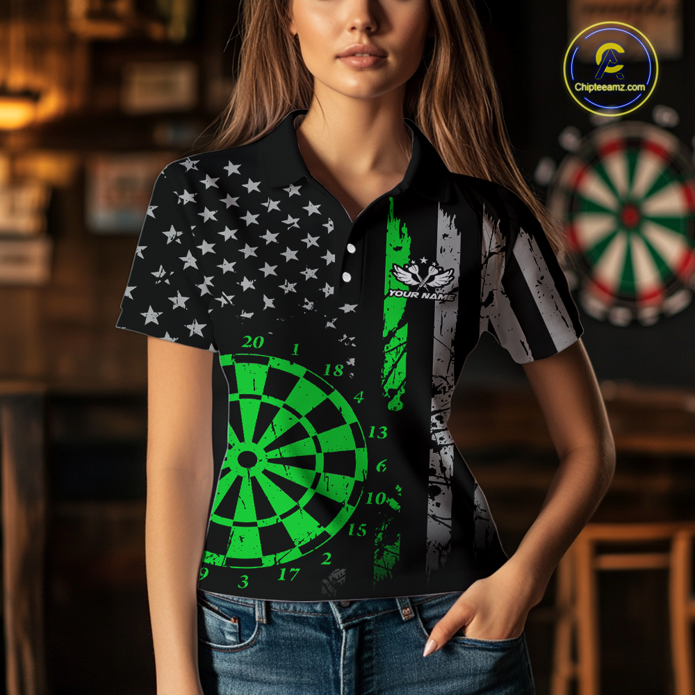 Custom Green US Flag Darts Shirt for Women Darts Team Jerseys Dart Tourament Polo & 1/4 Zip NNT116