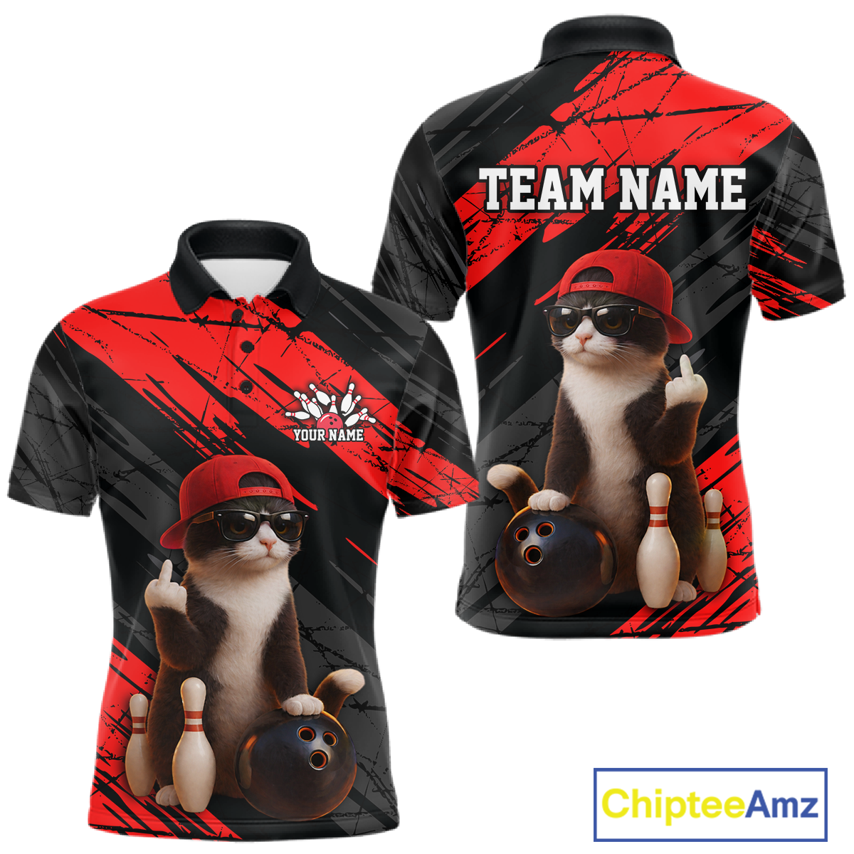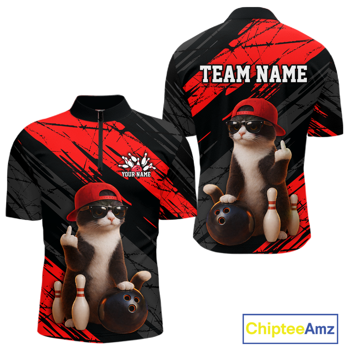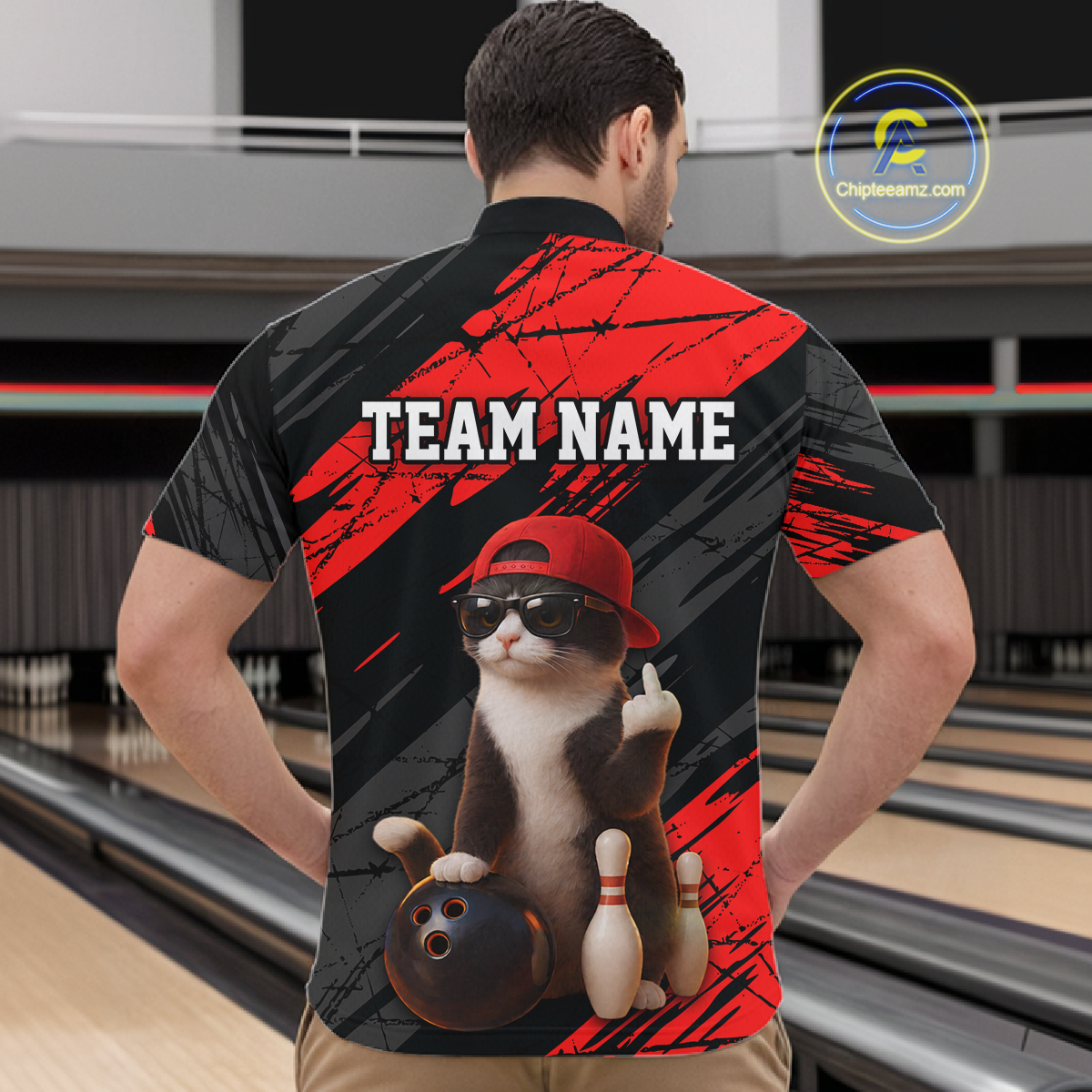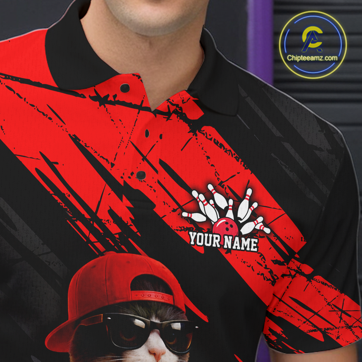 Custom Funny Cat Red Bowling Jersey for Men Bowling Polo & 1/4 Zip Bowling Team Shirts HNT198