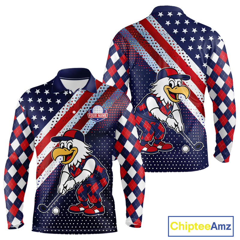 Funny American Flag Eagle Mens Long Sleeve Polo Golf Shirts Patriotic Red & Blue Argyle Pattern Golf Ball Custom NHN0044