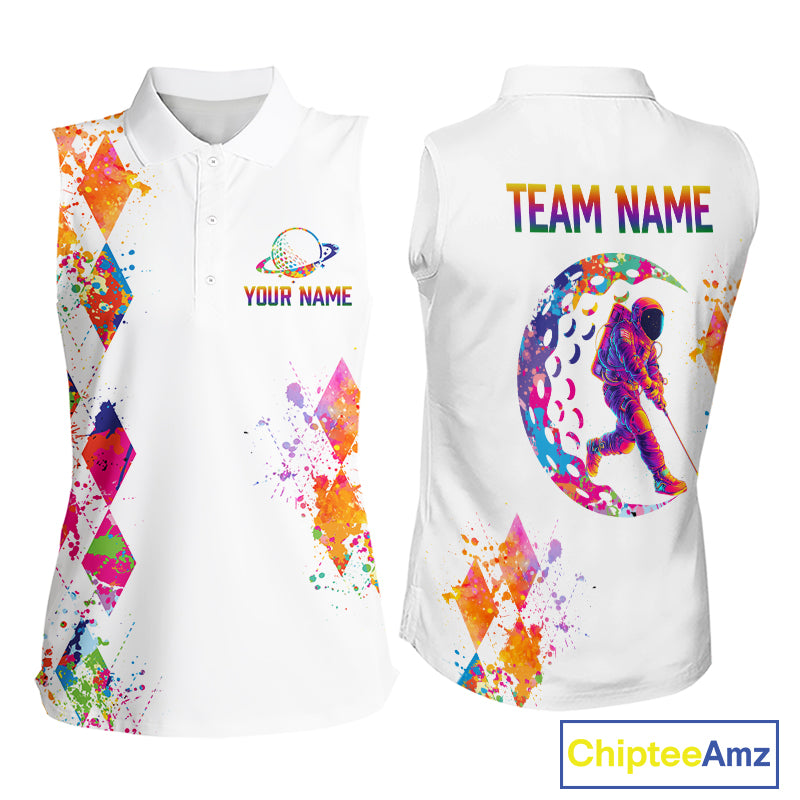 Funny Astronaut Womens Sleeveless Golf Polo Shirt Argyle Pattern Watercolor Golf Gifts NHN0006