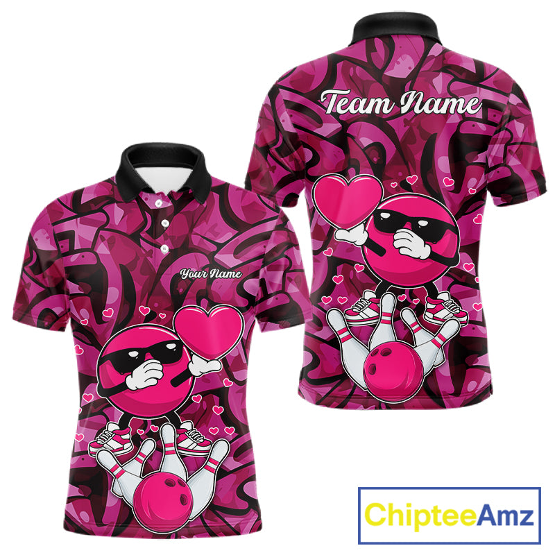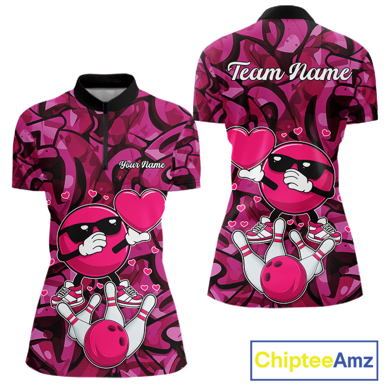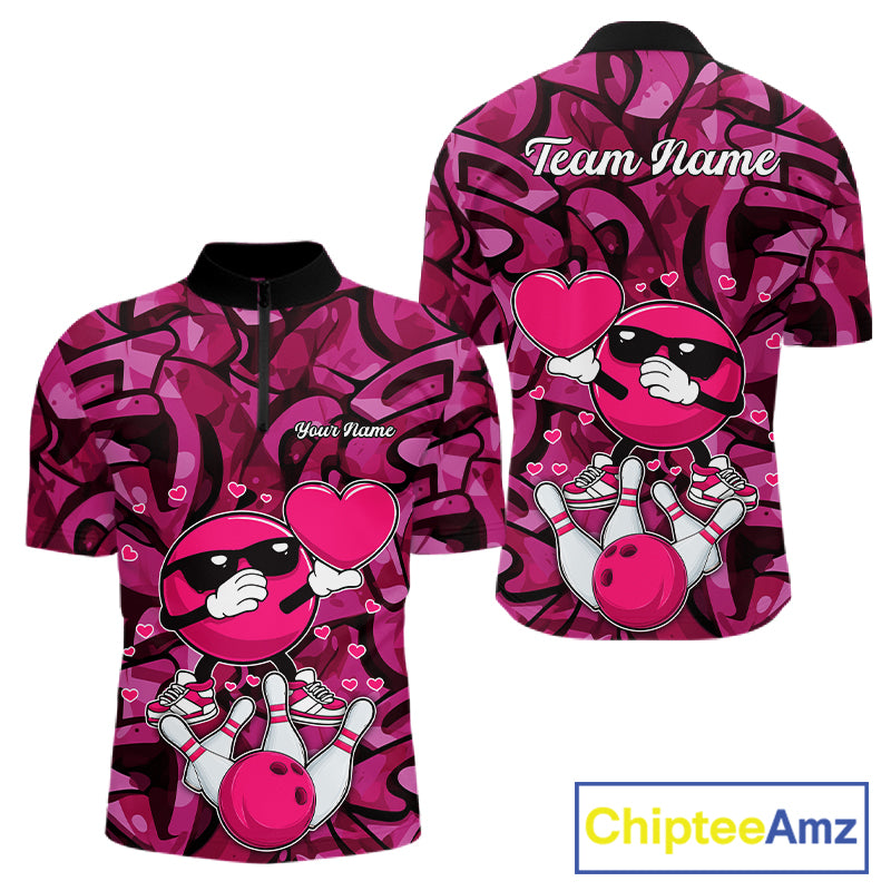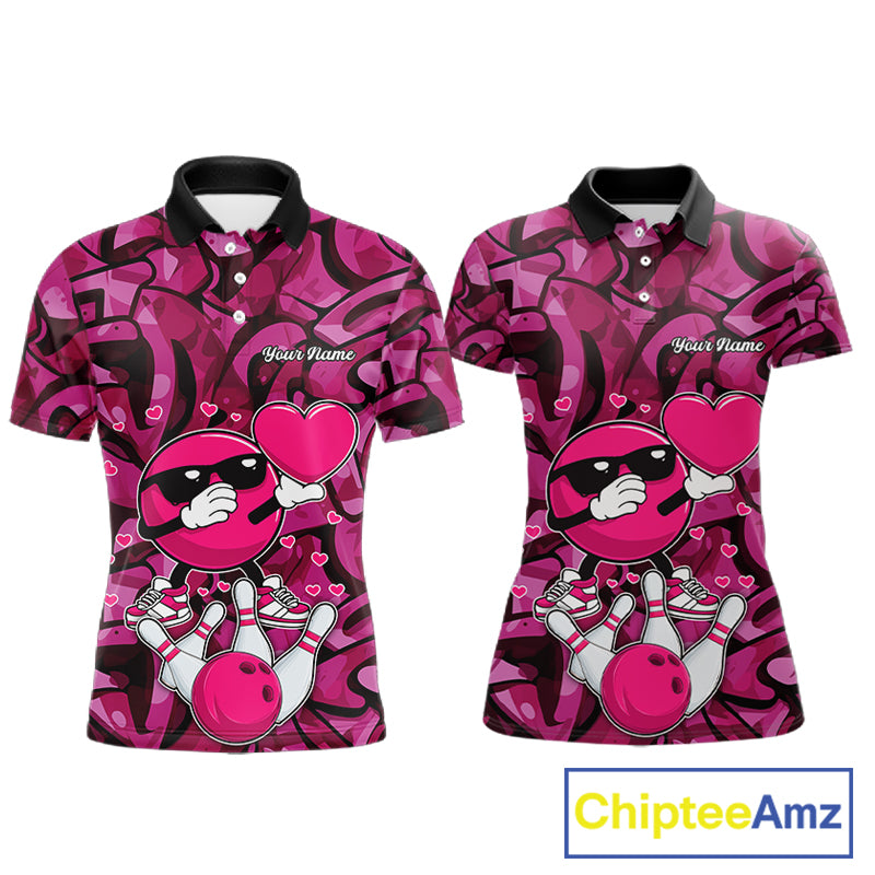 Funny Bowling heart pink graffiti pattern Custom Valentine matching bowling shirts for couples NQS11322