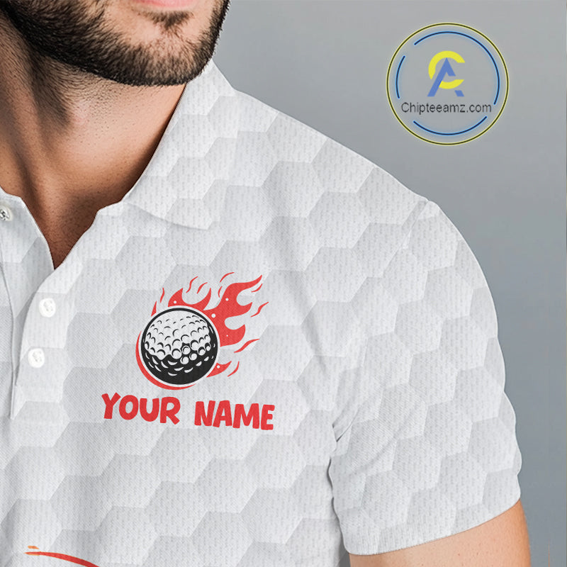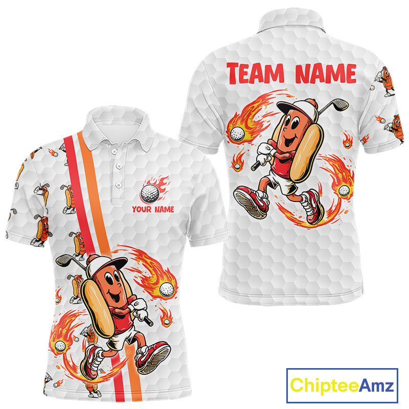 Funny Mens Golf Polo Shirt Custom Orange And White Fire Flame Hot Dog Pattern White Golf Shirts NHN0001