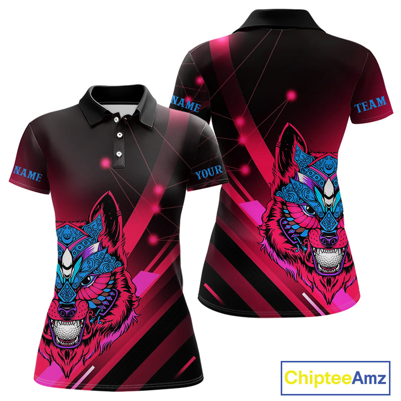 Funny Pink Wolf Golf Polo Shirt for Women Custom Golf Ball Team Jersey Womens Golf League Shirt Golf Gifts