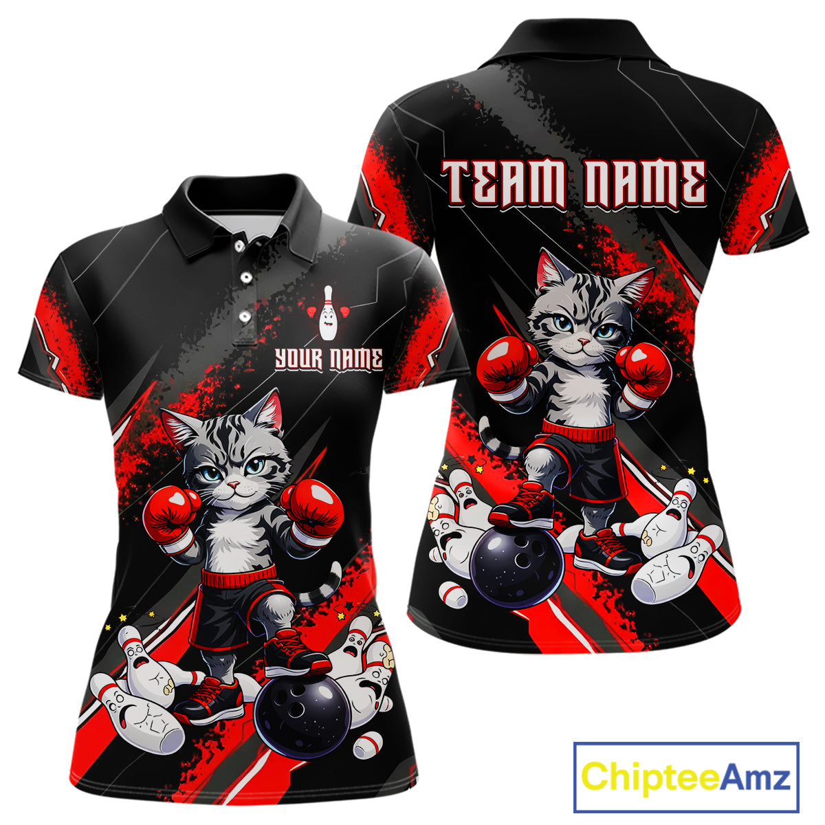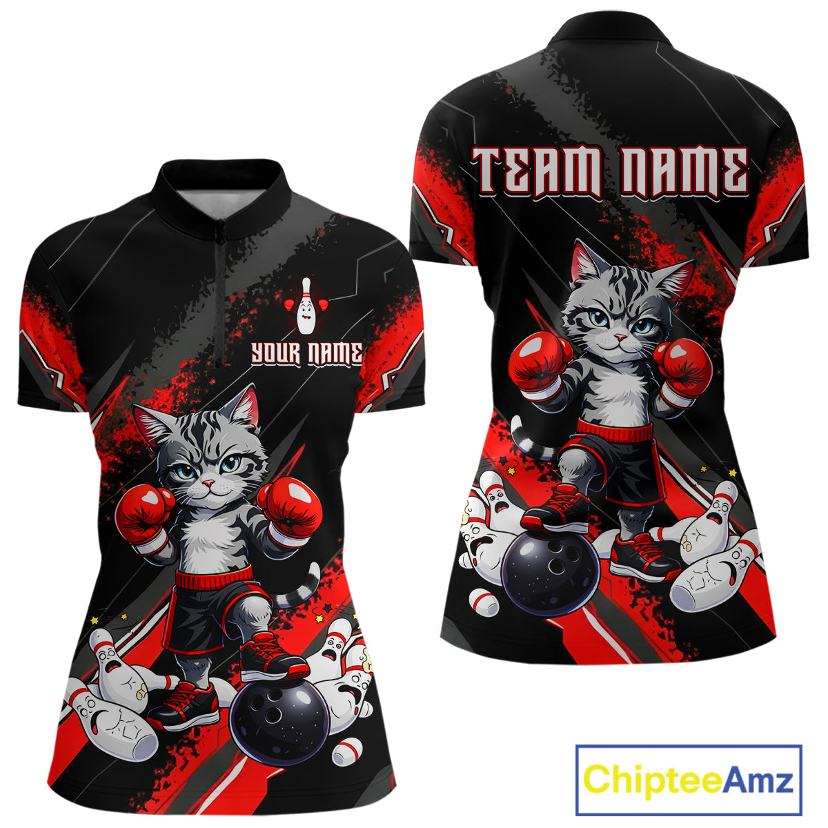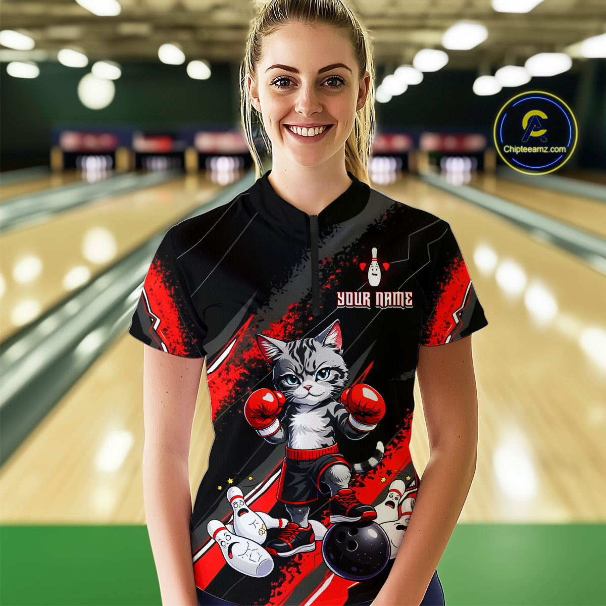 Funny Red Cat Bowling Team Jersey Personalized Polo & 1/4 Zip Shirt for Women Bowling League QZT825