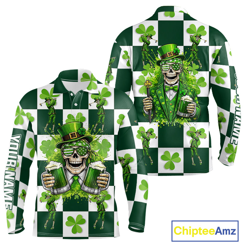Funny Skull drink beer Clover square pattern Mens Golf Polo shirts Custom St Patrick's Day golf tops NQS11454
