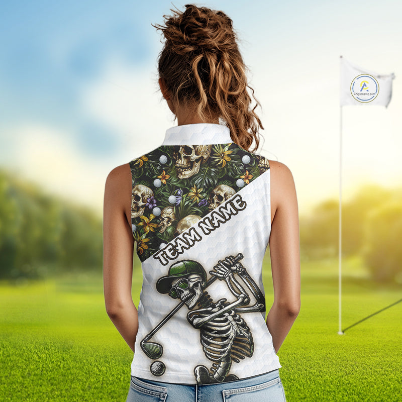 Funny Womens Sleeveless Golf Polo Shirts Custom Green Tropical Pattern Personalized Skull Golf Shirts NHN0071