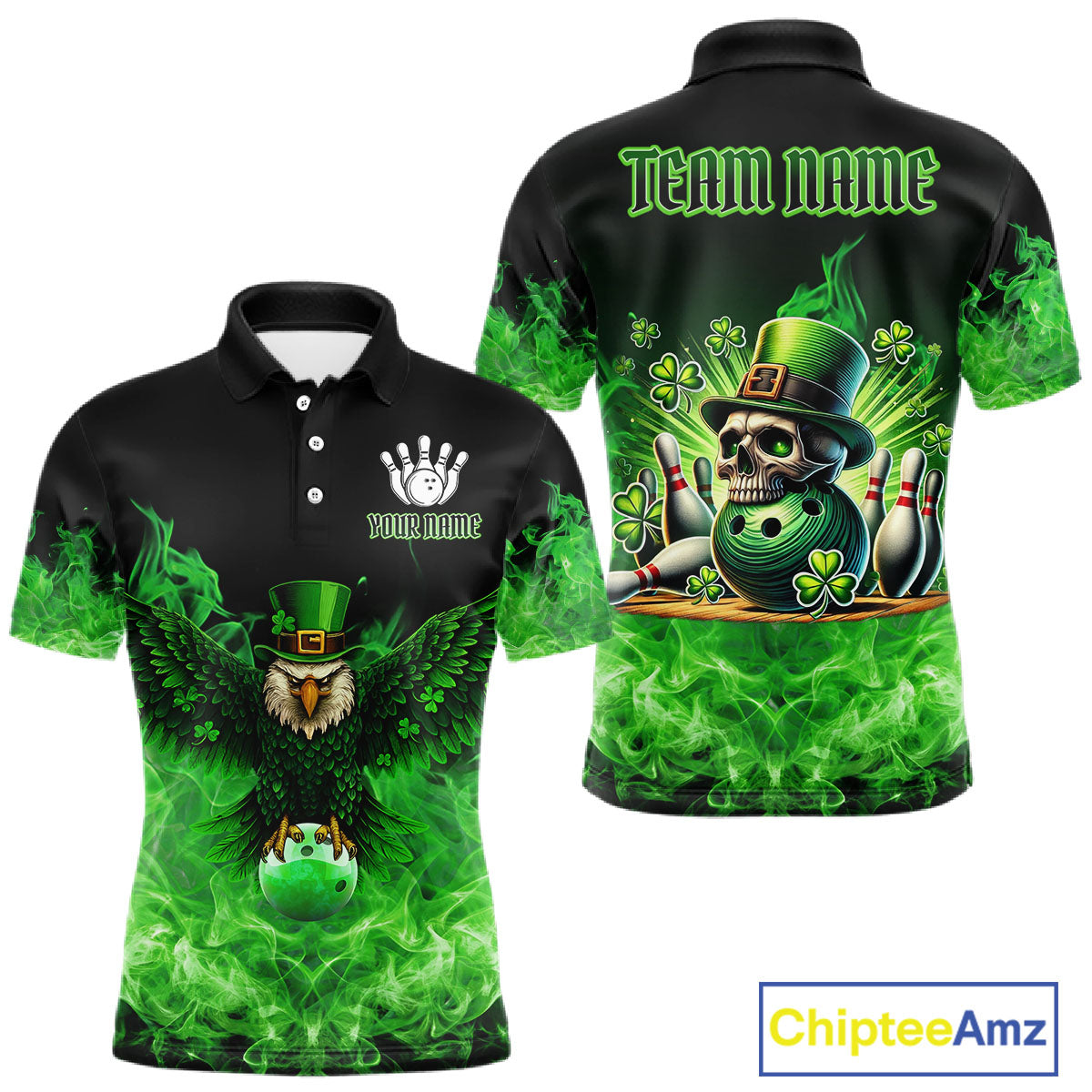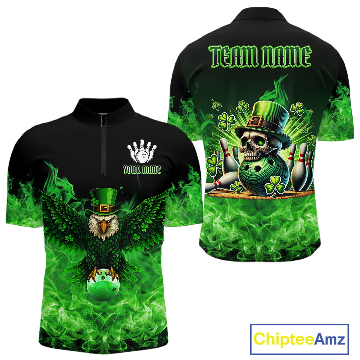 Green Flame Smoke St Patrick's Day Eagle Skull Men's Bowling Shirts Custom Lucky Bowling Team Jersey NQS11286