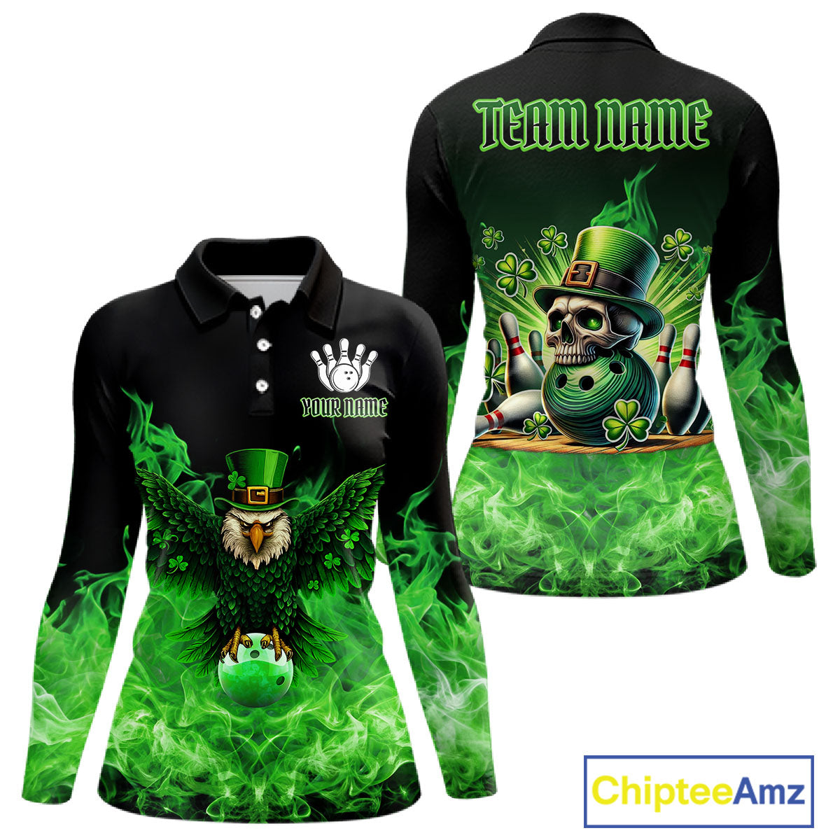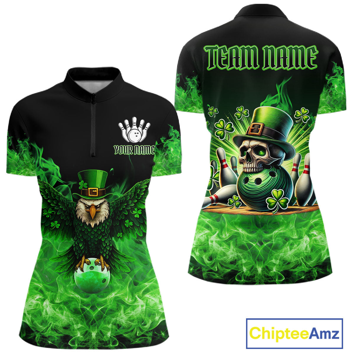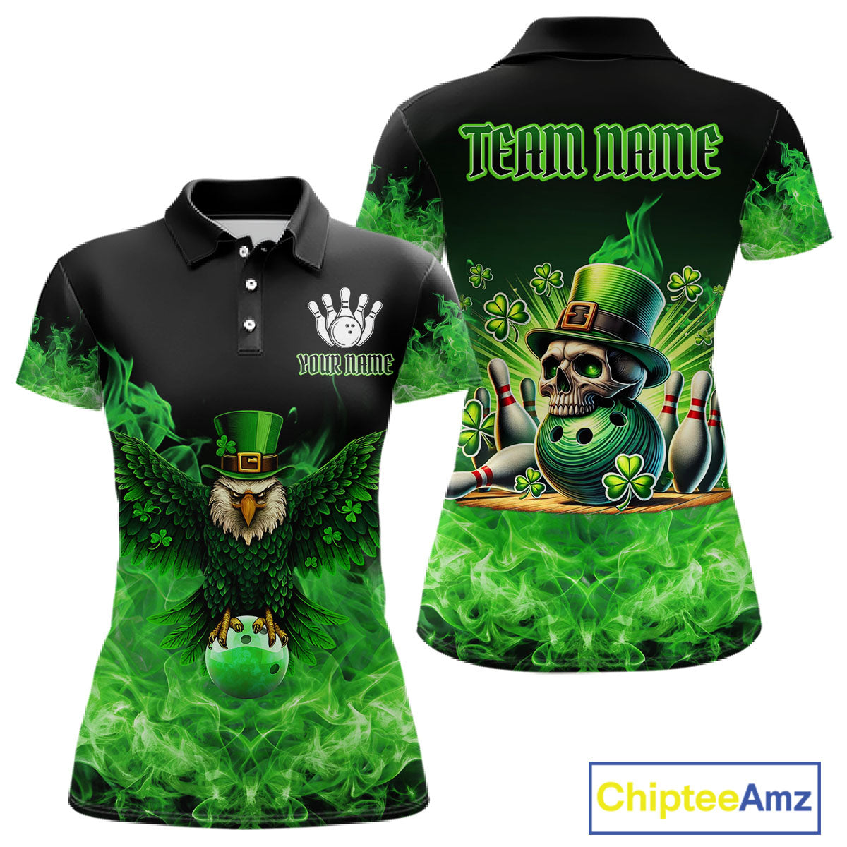Green Flame Smoke St Patrick's Day Eagle Skull Women's Bowling Shirt Custom Lucky Bowling Team Jersey NQS11286