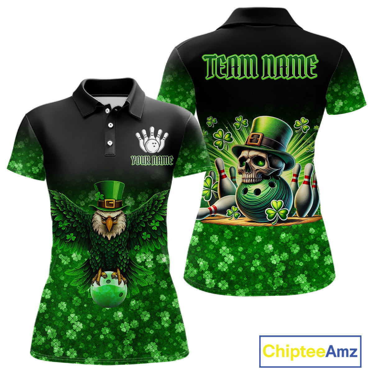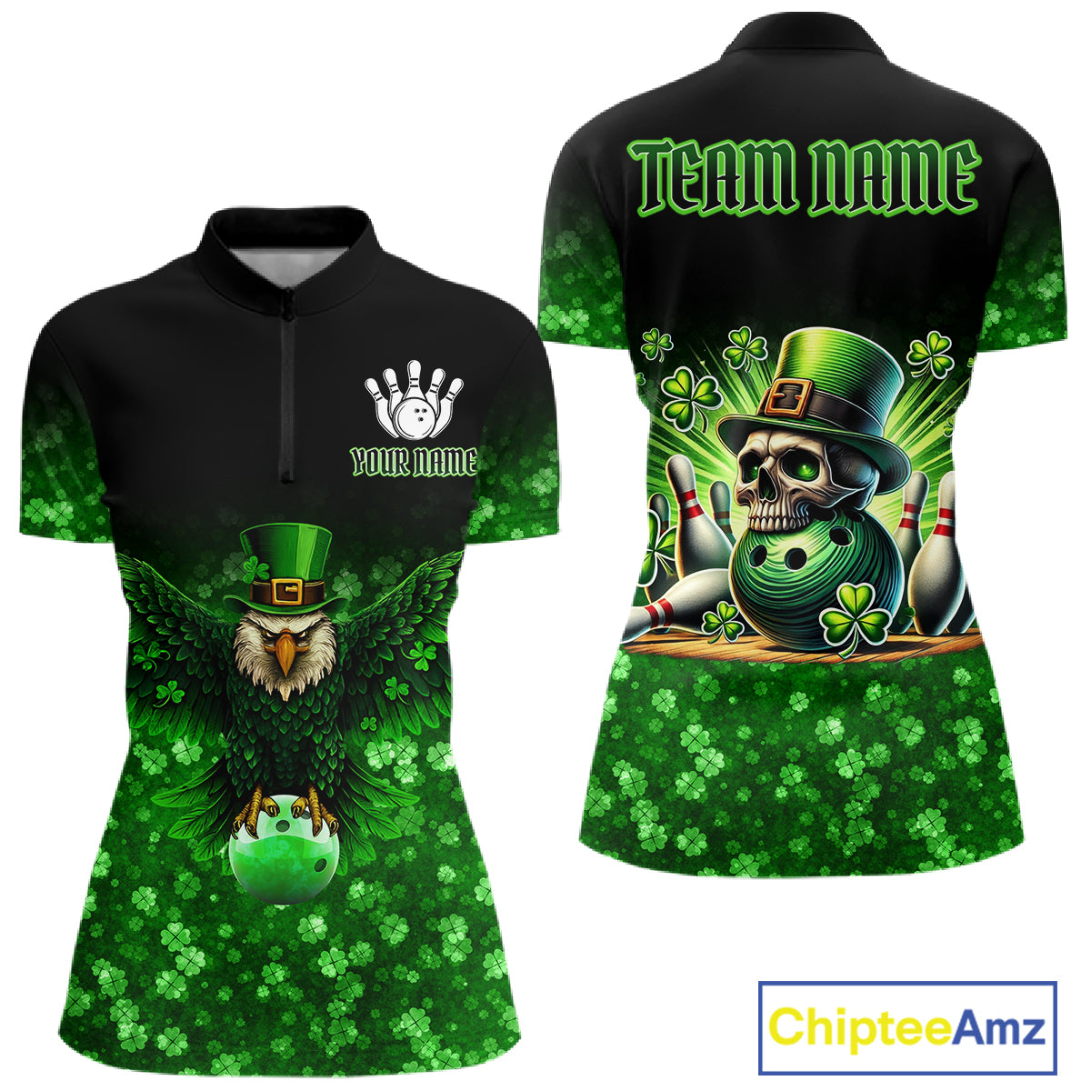 Green shamrock St Patrick's Day Eagle Skull Women's Bowling Shirts Custom Lucky Bowling Team Jersey NQS11287