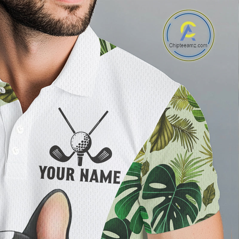Green Tropical Pattern Mens Golf Polo Shirts Custom Cute Bulldog Golf Tops, White Golf Outfit For Men NHN0067