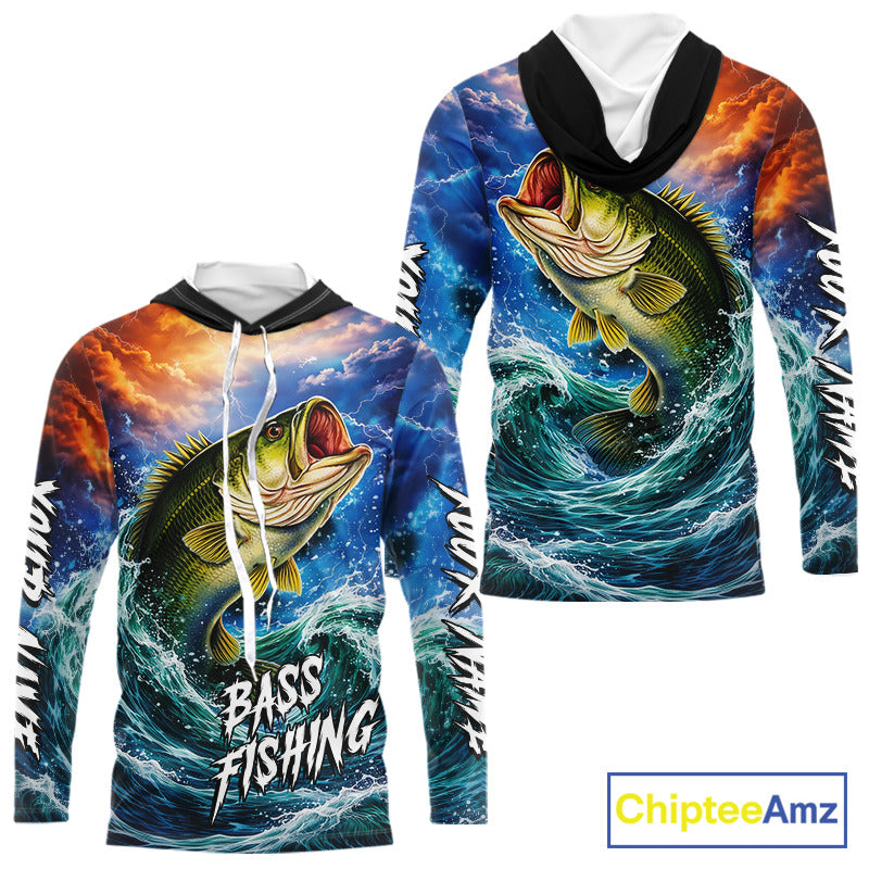 Personalized Bass Thunder And Lightening Long Sleeve Hooded Fishing Shirts, Custom Bass Fishing Jerseys NBT378