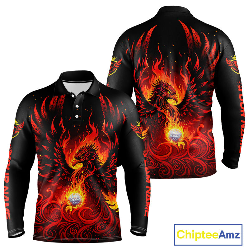 Long Sleeve Golf Polo Shirt Custom Phoenix Red Flame Team Golf Tops, Black Golf Outfit For Men NHN0084