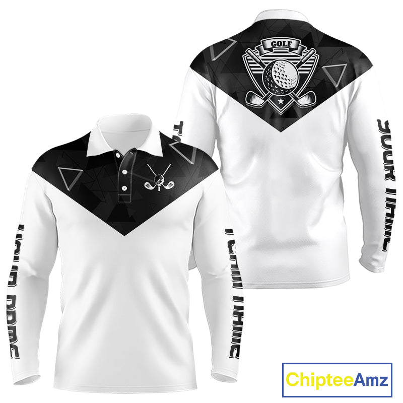 Long Sleeve Golf Polo Shirt For Men Black Geometric Triangle Pattern Custom Name White Golf Tops NHN0122