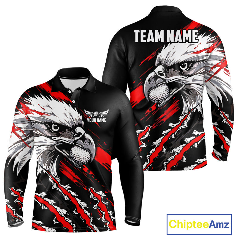 Long Sleeve Golf Polo Shirts Custom Red & Black Grunge Pattern Eagle Golf Shirts For Men, Golf Apparel NHN0062