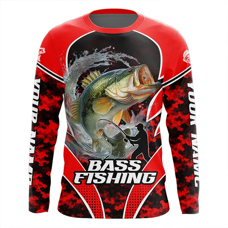 Personalized Bass Fishing Shirts Long Sleeve, UV Protection Shirt Customize Name Fishing | Red NHT394