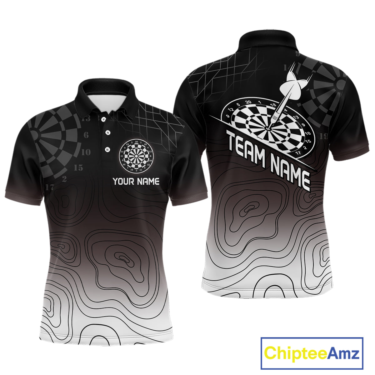 Men's Custom Dart Shirt, Darts Hitting The Bullseye With Black-To-White Gradient NYN0249