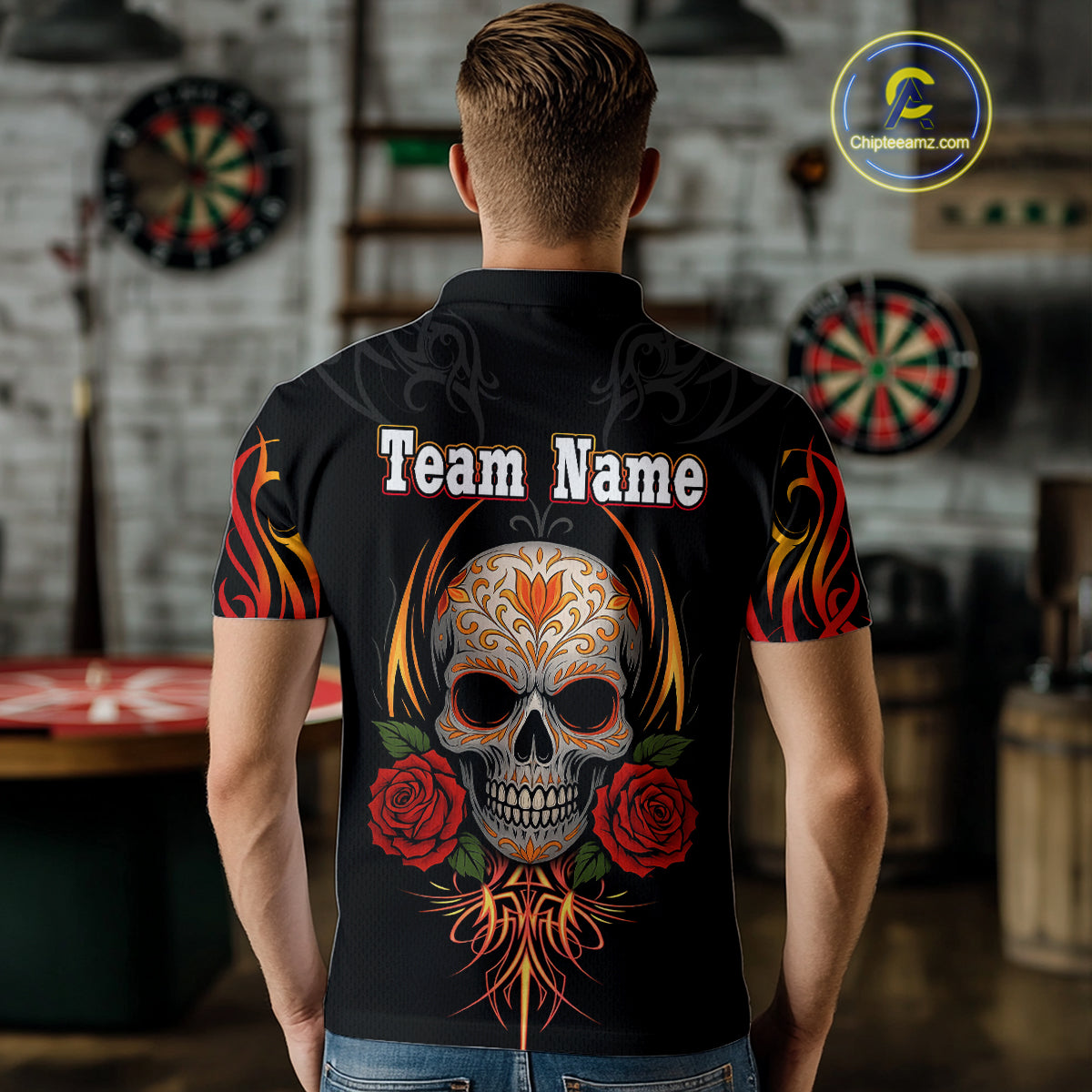 Men's Custom Darts Shirt With Roses Skull Polynesian Pattern And Red Dartboard NYN0254