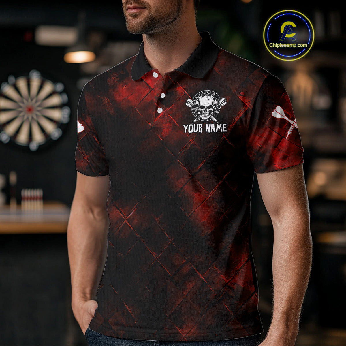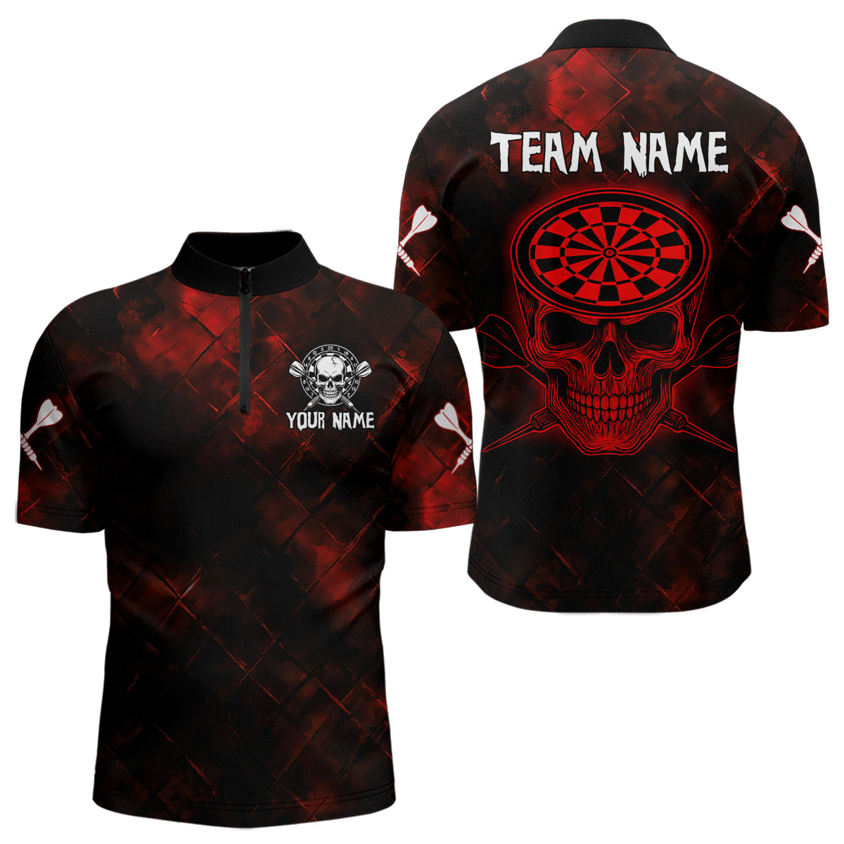 Men's Custom Darts Team Shirt - Skull & Dartboard Graphic With Grunge Red Pattern NYN0320