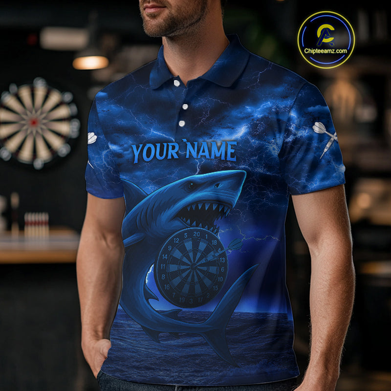 Men's Custom Darts Shirt - Cobalt Lightning Shark In Ocean With Dartboard And Arrow NYN0330
