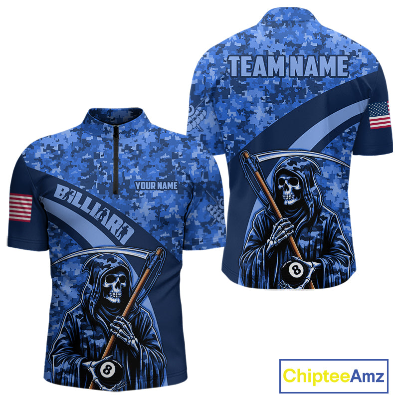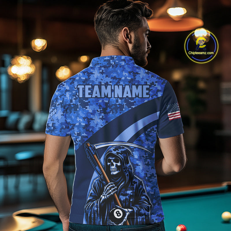 Personalized Grim Reaper Blue Camo Billiard Shirts For Men Custom Military Billiard Jerseys TDM3985