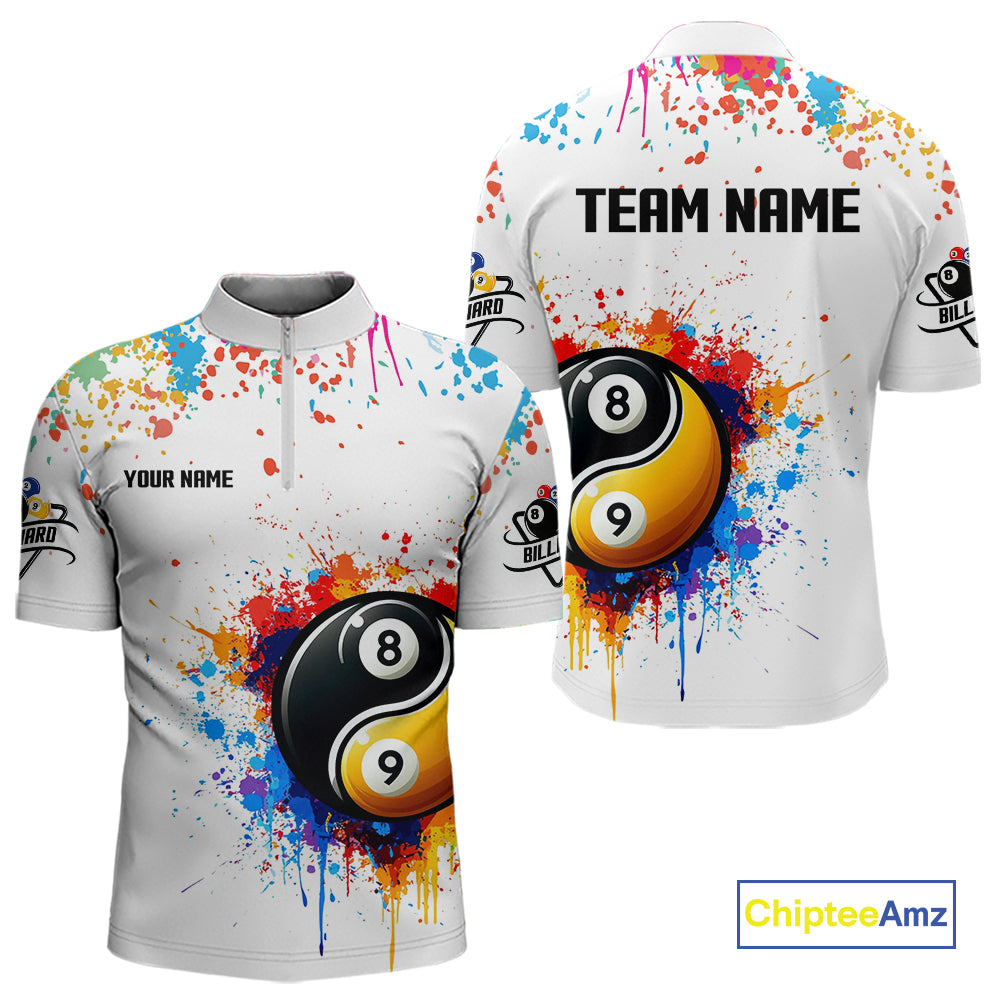 Funny Yin Yang 8 Ball & 9 Ball Colorful Splash Custom Men's Billiard Shirts, Pool Jerseys|White TDM4018