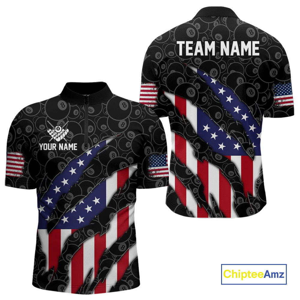 Personalized American Flag Billiard Shirts For Men, Patriotic 8 Ball Pool Team Jersey | Black TDM4027