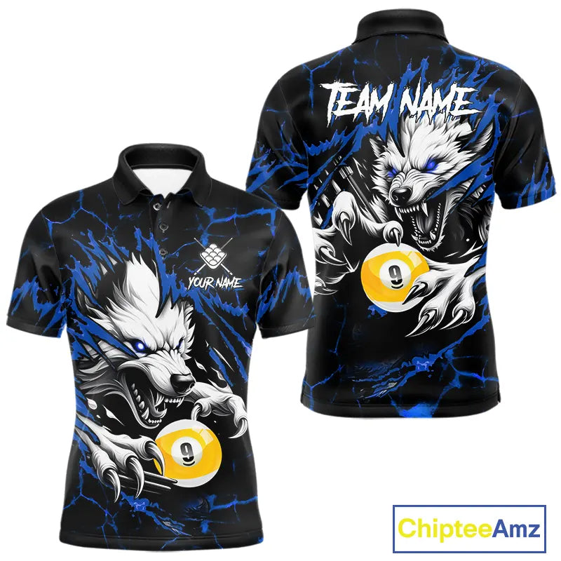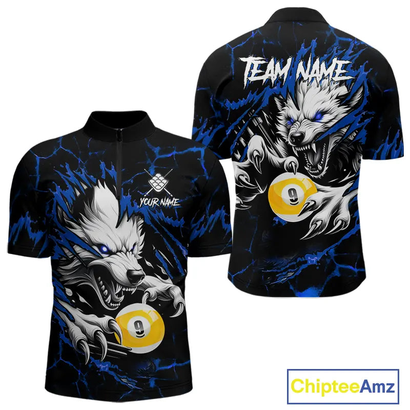 Personalized 9 Ball Pool Wolf Billiard Shirts For Men, Billiard Team Jersey Polo & 1/4 Zip |Blue TDM5468