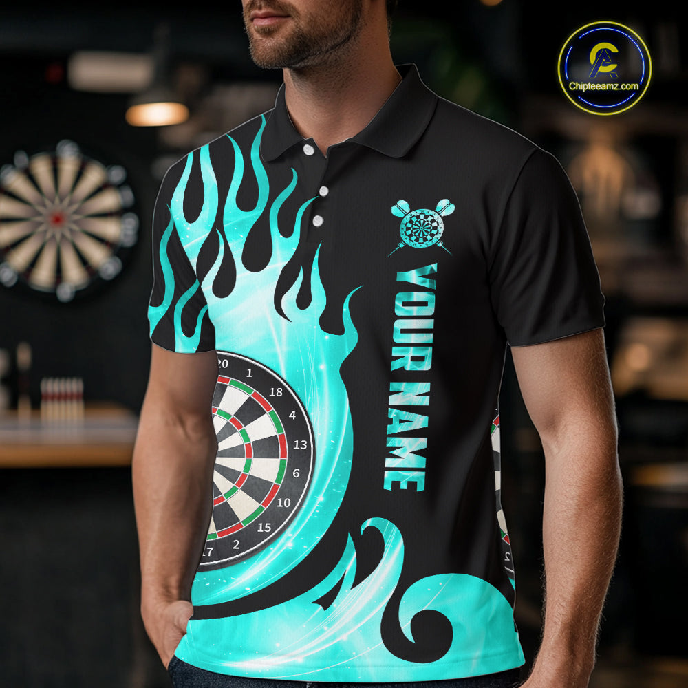 Black And Turquoise Flame Light Darts Polo & 1/4 Zip For Men Custom Darts League Team Jersey TDM5479