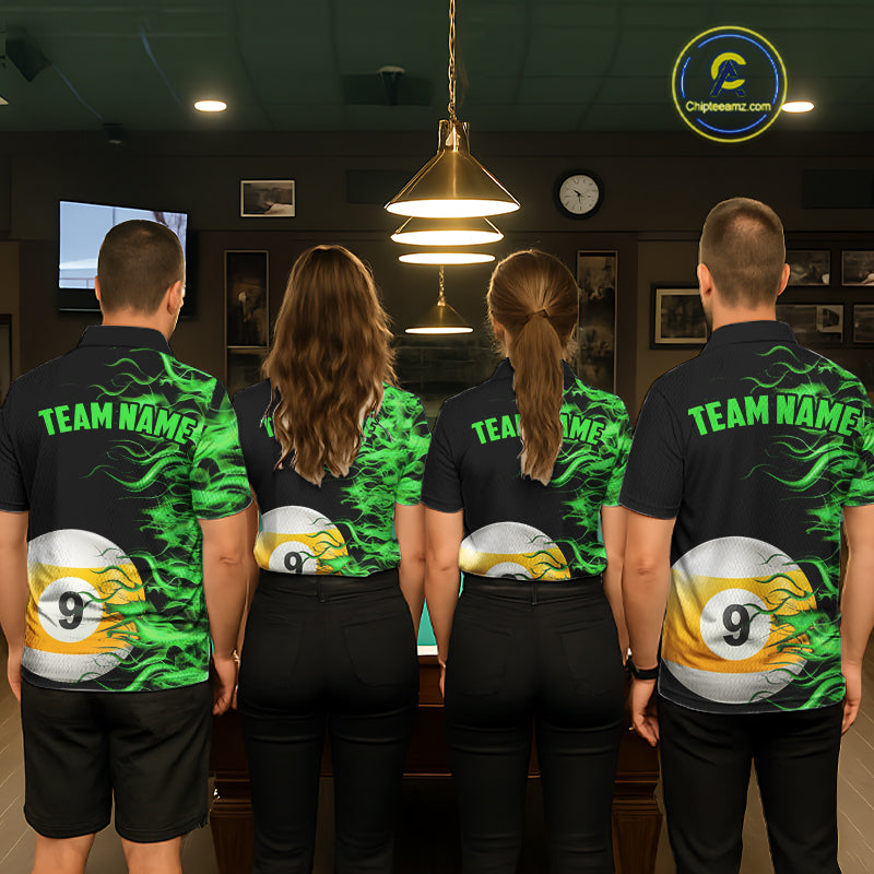 Green Flaming 8 Ball & 9 Ball Billiard Shirt For Men Custom Pool Team Jersey Polo & 1/4 Zip TDM5482