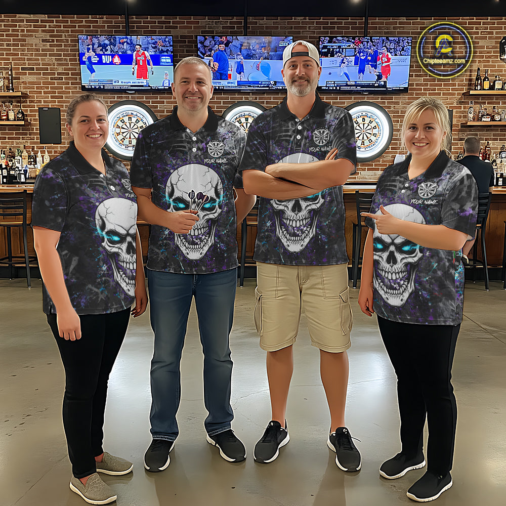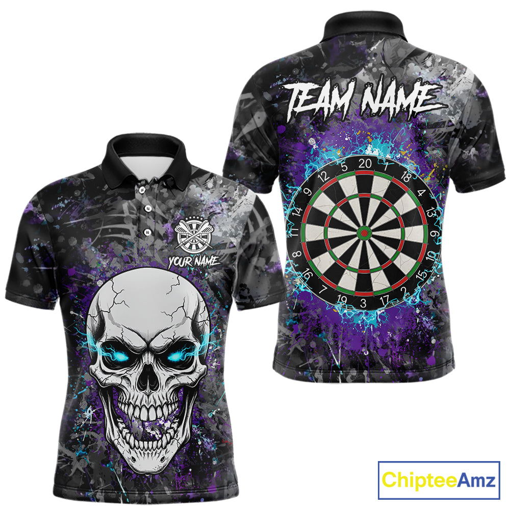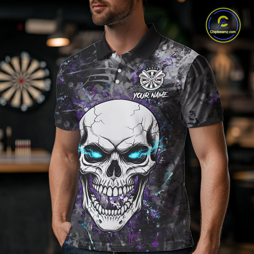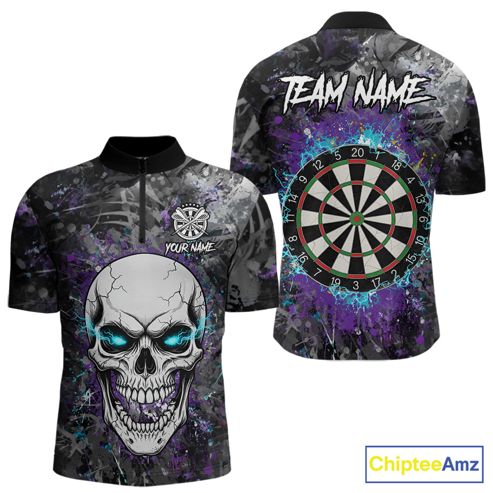 Blue Purple Grunge Skull Darts Polo & 1/4 Zip For Men Custom Darts Team Jersey, Funny Darts Gifts TDM5504