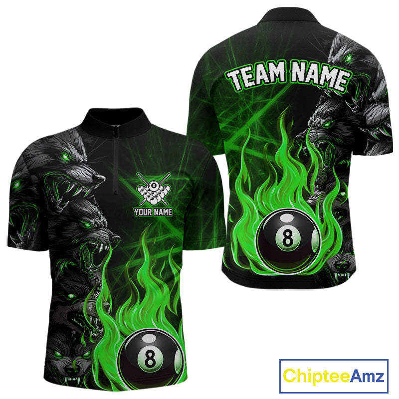 Personalized Wolf Flaming 8 Ball Pool Fire Men Billiard Shirts Team League Billiard Jerseys |Green TDM5596