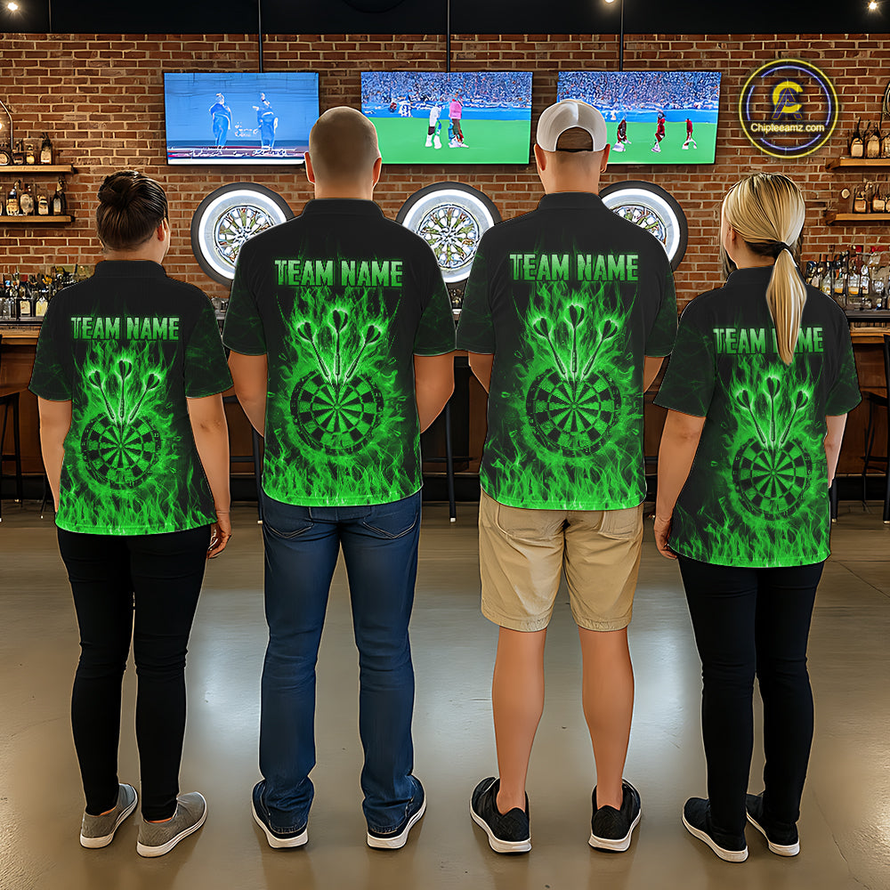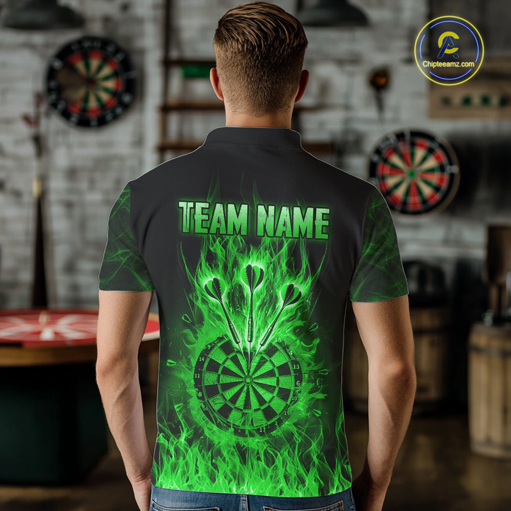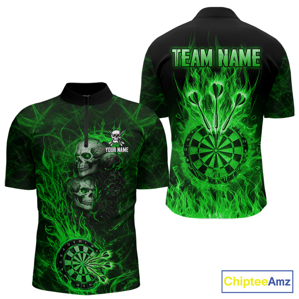 Green Flaming Skull Darts Polo & Quarter Zip Custom Fire Darts Shirt For Men, Darts Team Jersey TDM5621