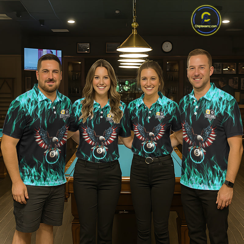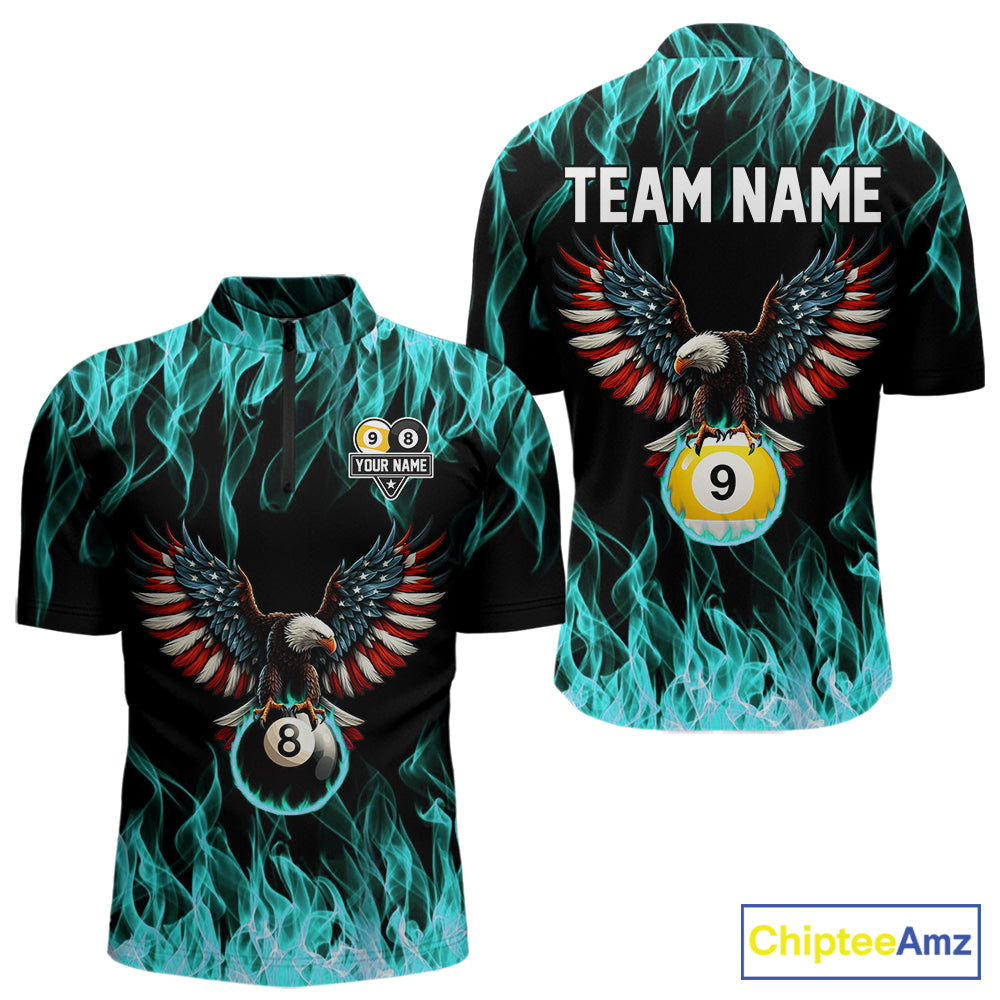 Turquoise Flaming American Flag Eagle 8 Ball 9 Ball Billiard Shirt For Men Custom Pool Team Jersey TDM5654