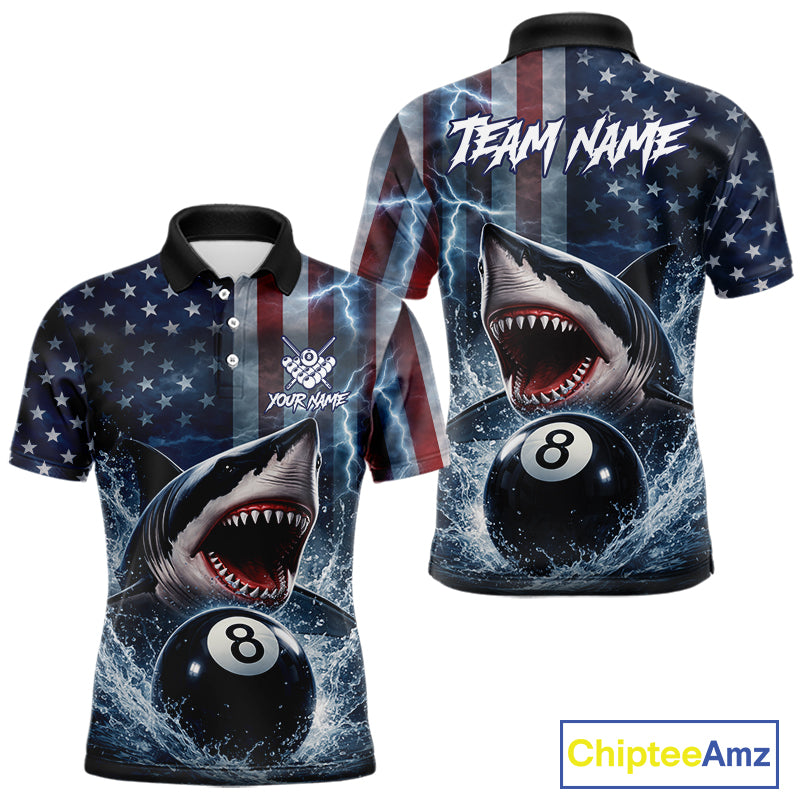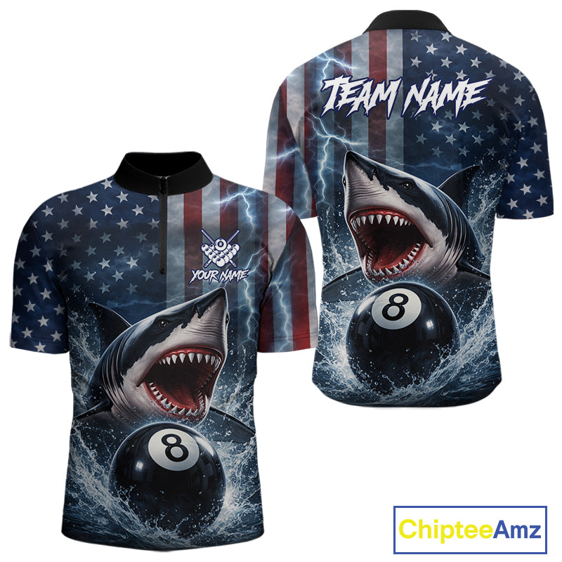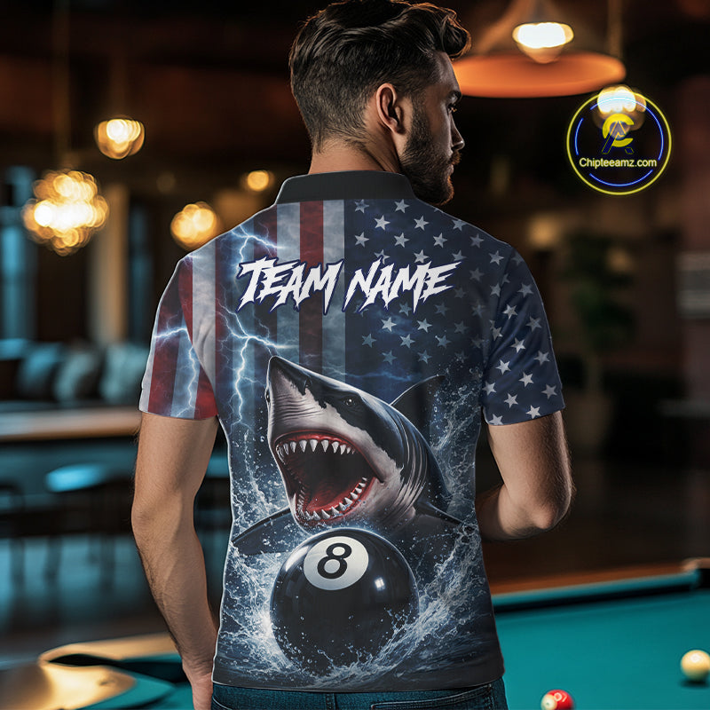 American Flag Shark 8 Ball Billiard Shirt For Men Custom Lightning Patriotic Pool Team Jersey TDM5769