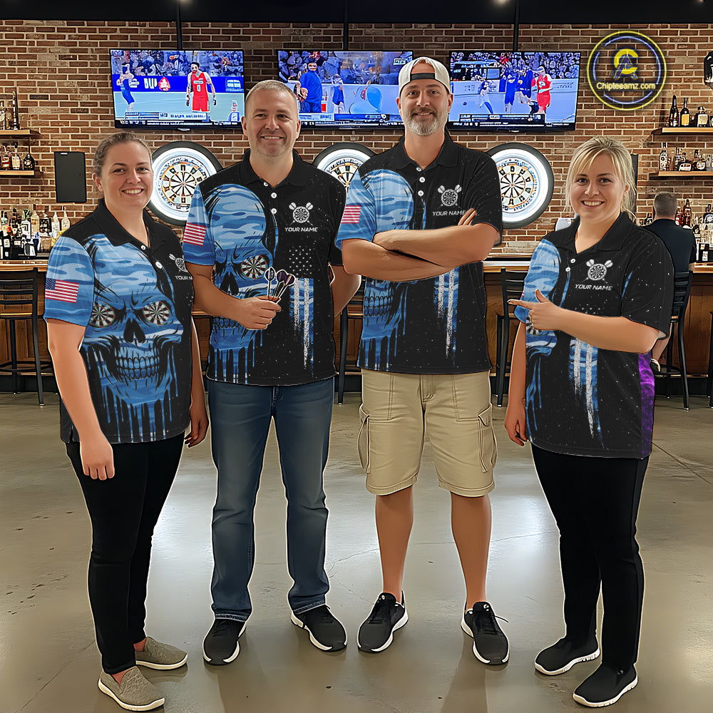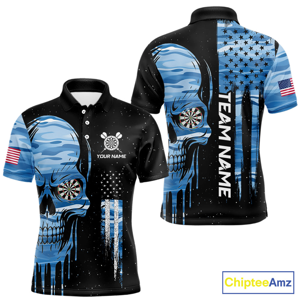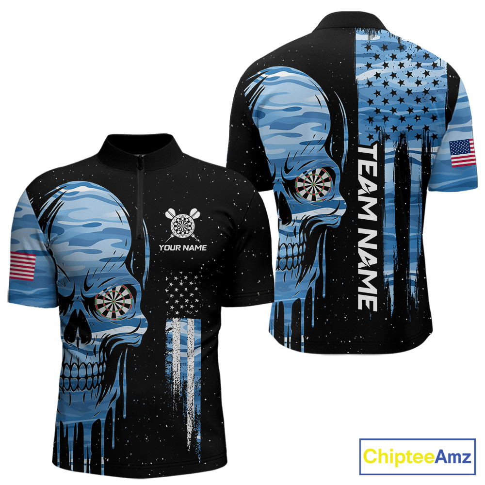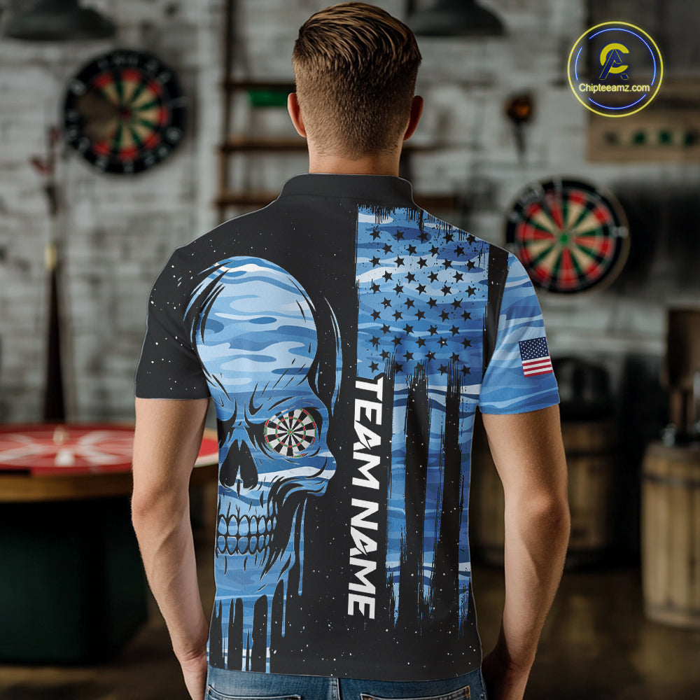Blue Camo Skull American Flag Dart Shirt For Men Custom Patriotic Dart Jersey Team Polo & 1/4 Zip TDM5772