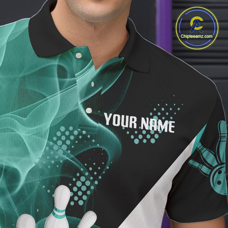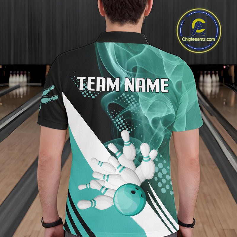 Mens bowling polo, 1/4 zip shirts Custom cyan blue smoke bowling team jerseys, gift for Bowlers NQS10060