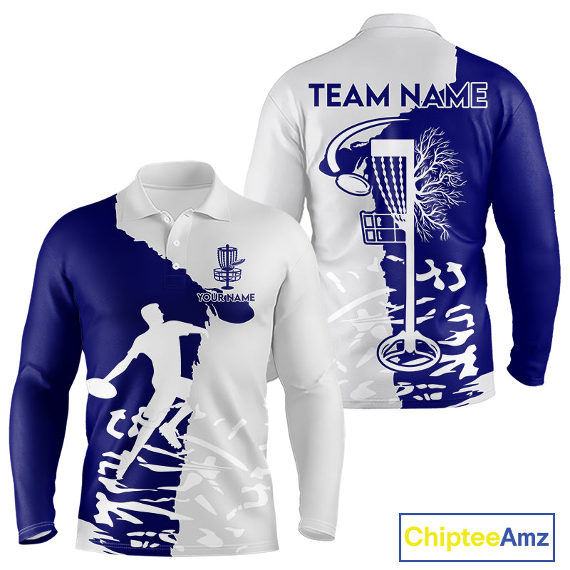 Mens Disc Golf Polo Shirt Custom Name White And Blue Disc Golf Basket Personalized Disc Golf Shirts NHN0033