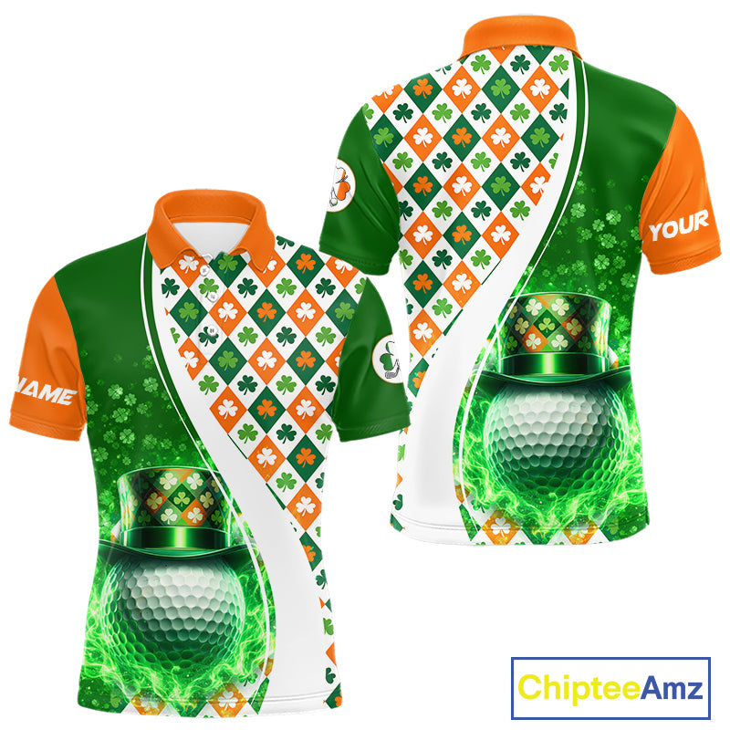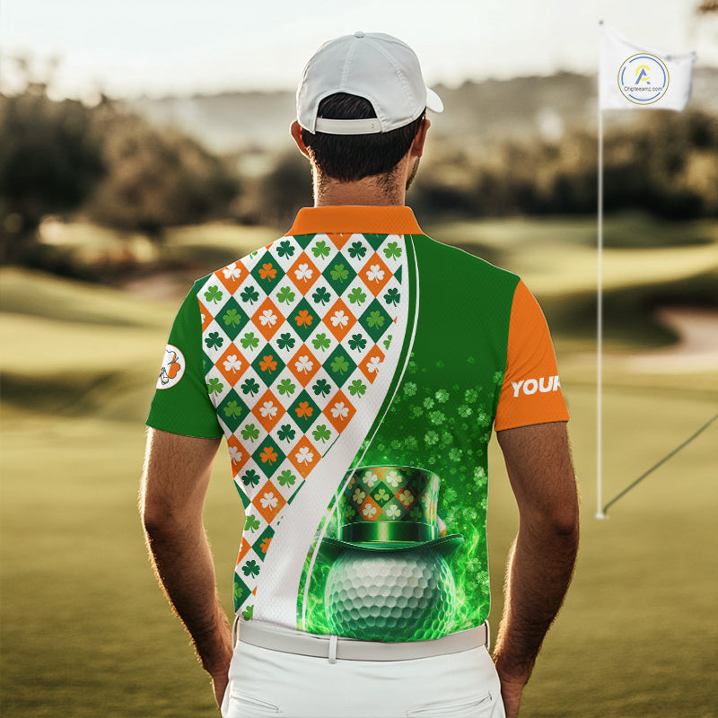 Mens Golf Polo Shirts Custom Green Clover St Patricks Day Plaid Pattern Ireland Flag Flame Golf Ball NHN0142