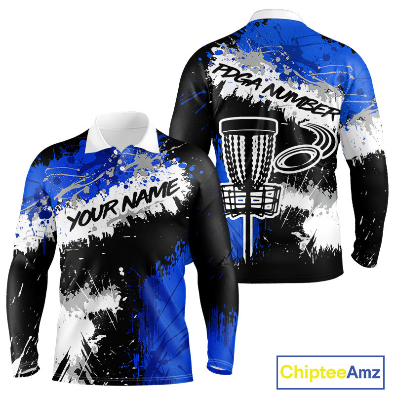 Mens Long Sleeve Disc Golf Polo Shirt Custom Name Number Blue Disc Golf Basket Golf Shirts NHN0028