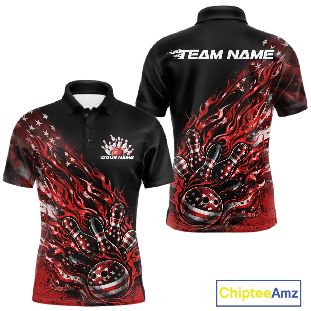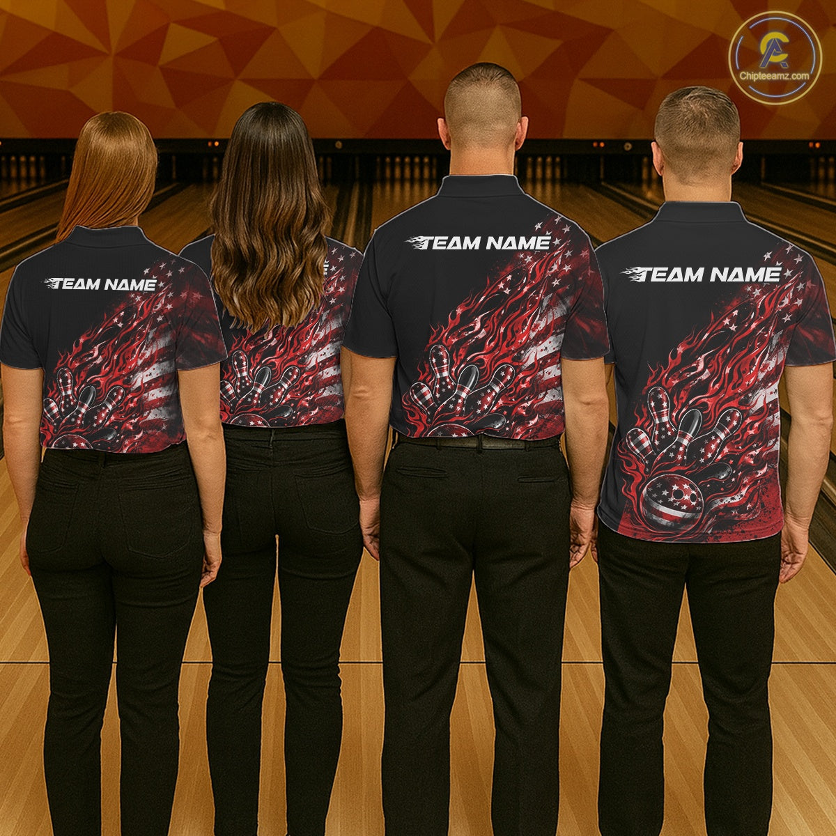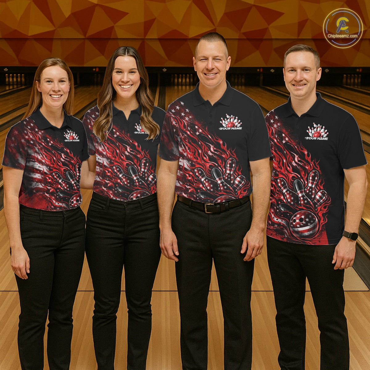Custom Patriotic Red Flame Bowling Shirts, US Flag Bowling Team Jerseys Freedom 4Th Of July Bowling Shirt IPHW10433