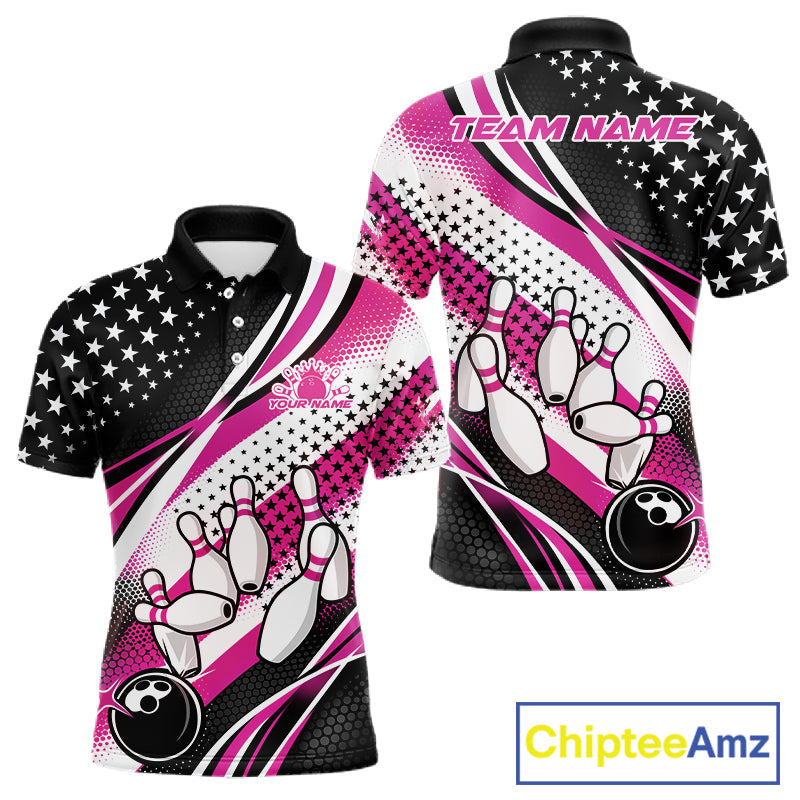 Custom Black And Pink American Flag Patriotic Bowling Shirts, US Flag Bowling League Shirt Bowlers Outfit IPHW10452