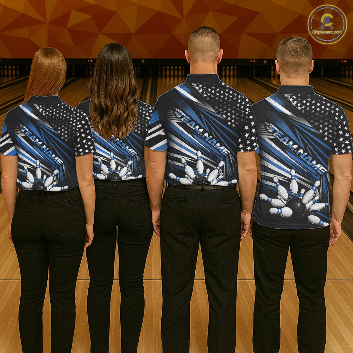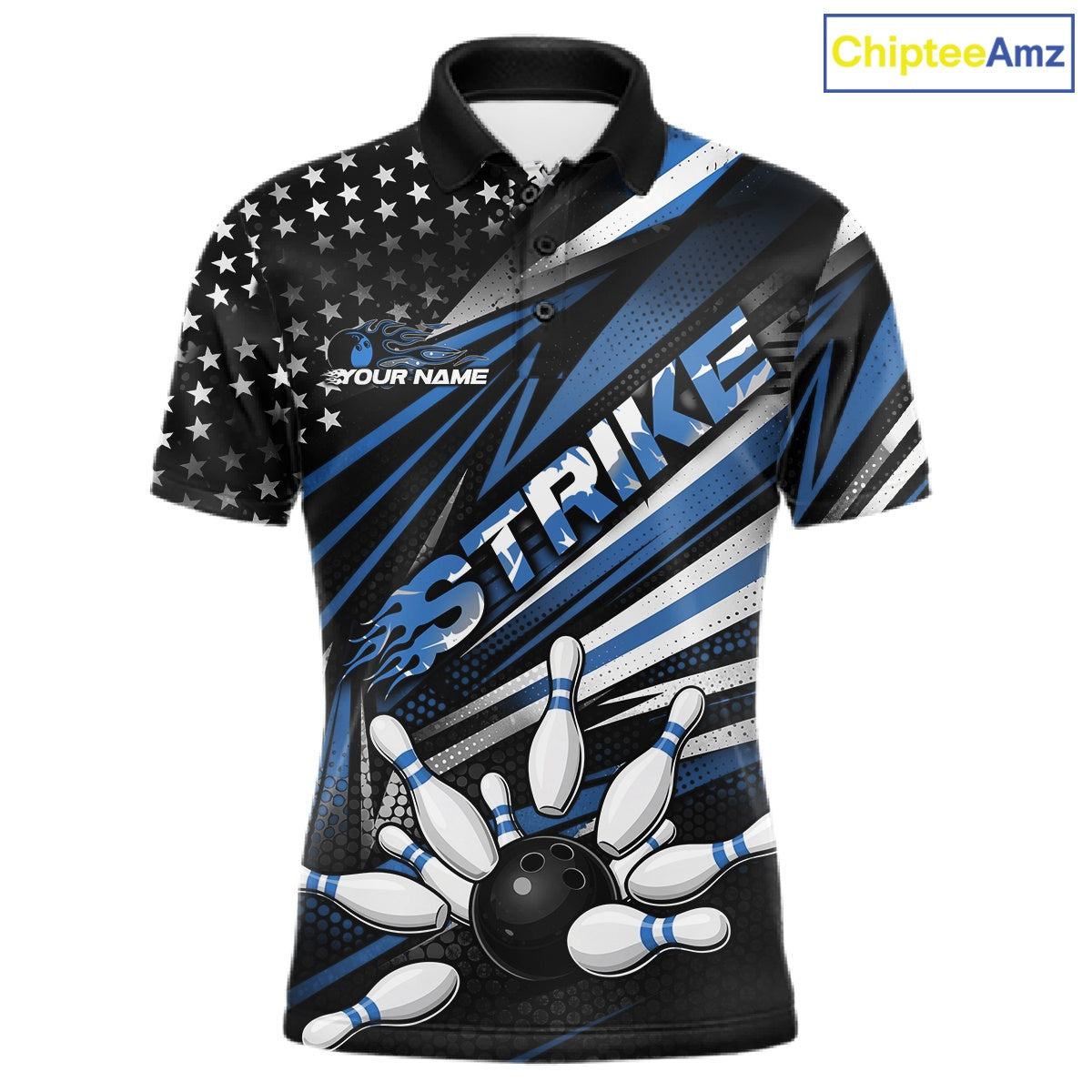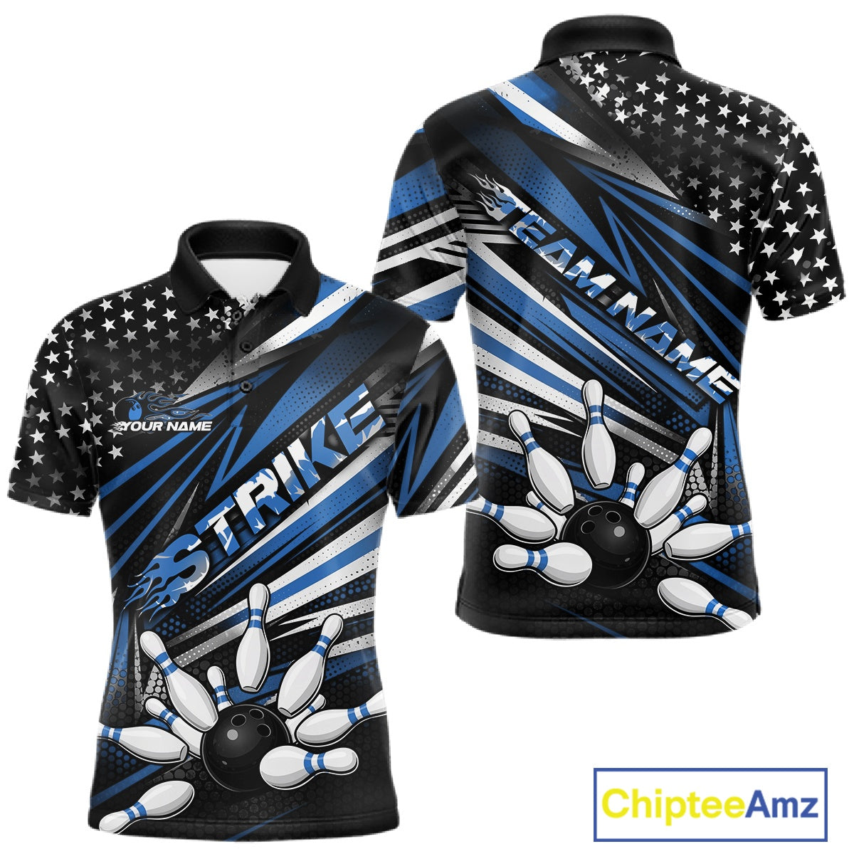 Custom Black And Blue US Flag Patriotic Strike Bowling Team Shirt, Freedom Bowling League Shirt Bowler Jerseys IPHW10458