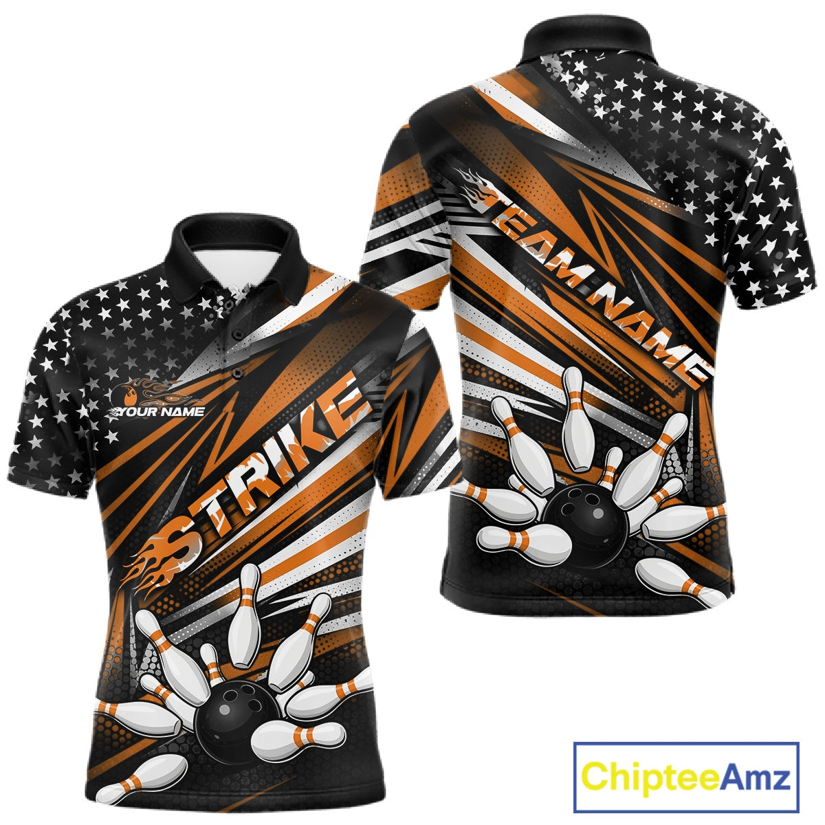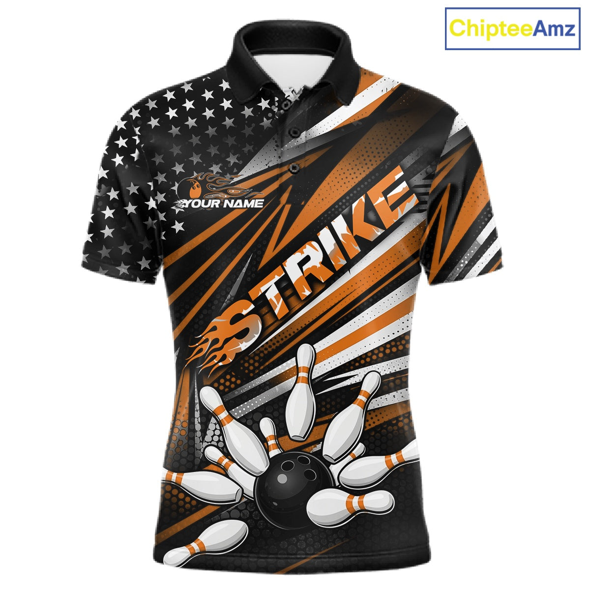 Custom Black And Orange US Flag Patriotic Strike Bowling Team Shirt, Freedom Bowling League Shirt Bowler Jersey IPHW10460