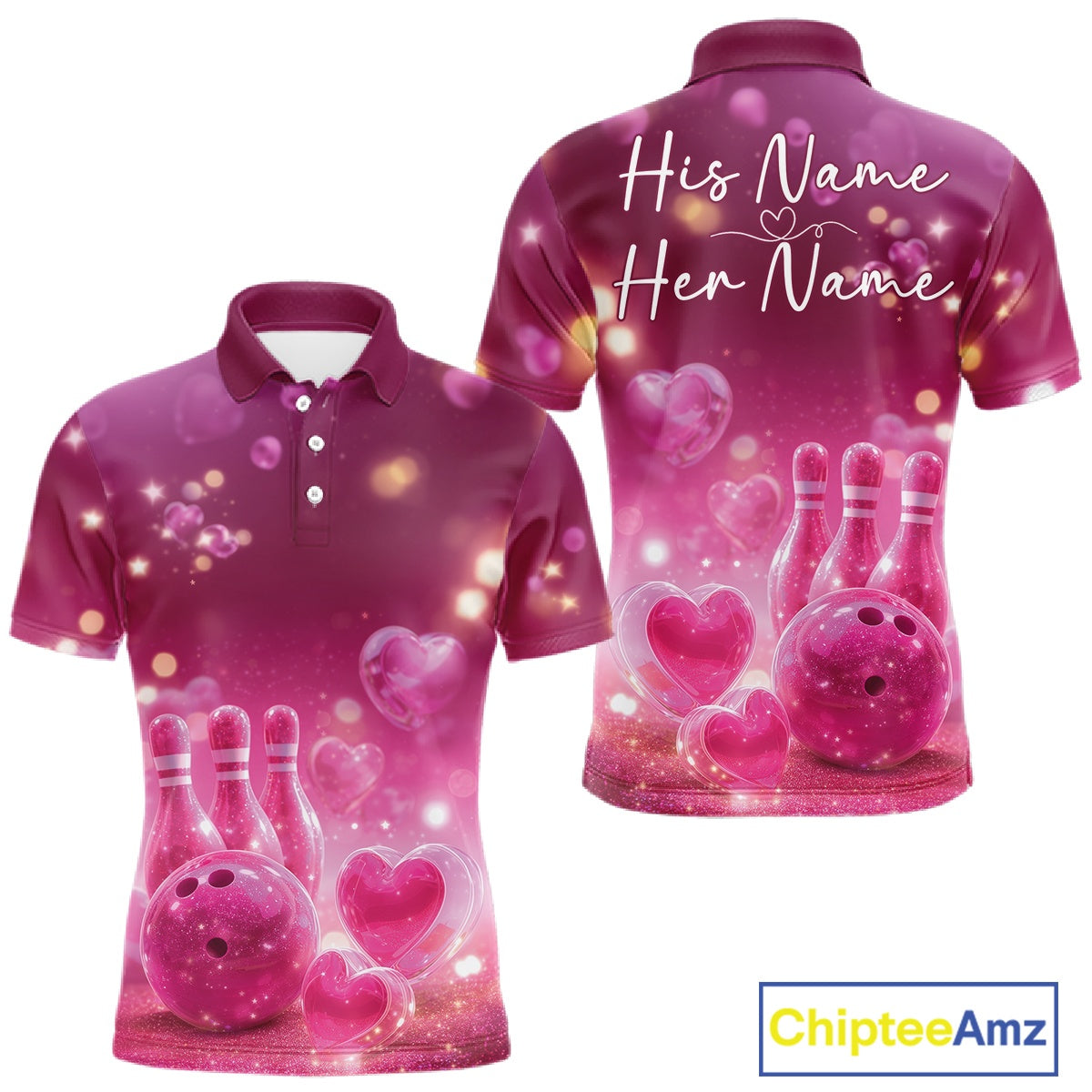 Custom Pink Valentine Bowling Couple Shirts, Pink Heart Theme Bowling Jerseys With His Name And Her Name IPHW10462