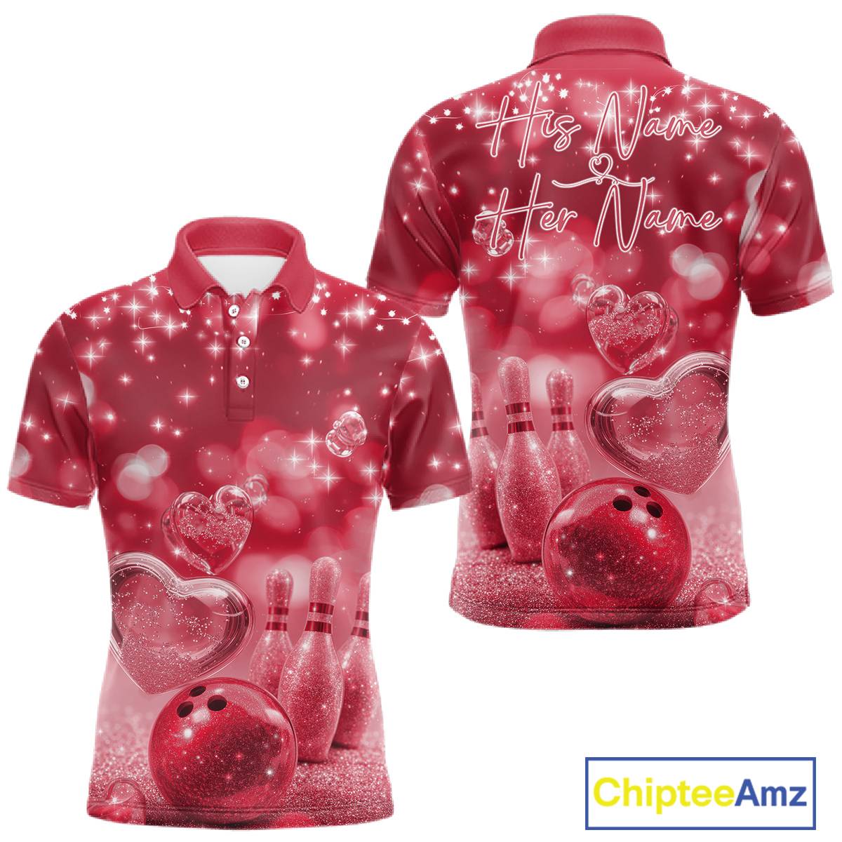 Custom Red Valentine Bowling Couple Shirts, Red Heart Theme Bowling Jerseys With His Name And Her Name IPHW10467