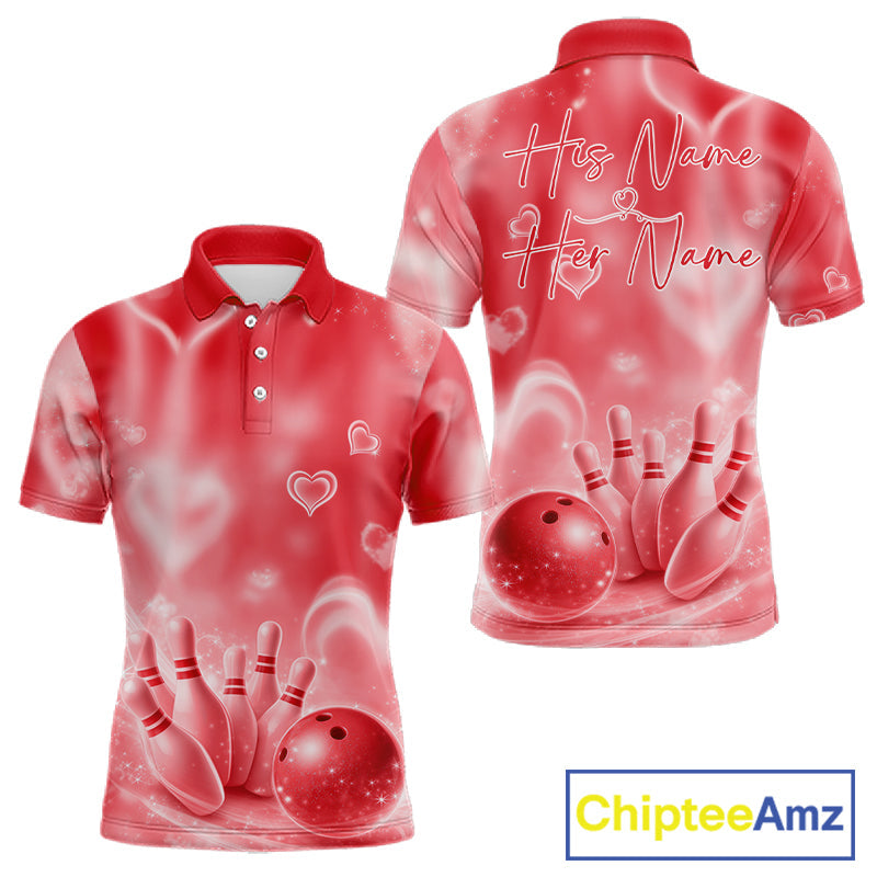 Custom Red Valentine Bowling Couple Shirts, Red Heart Theme Bowling Jerseys With His Name And Her Name IPHW10473