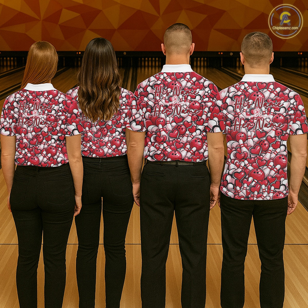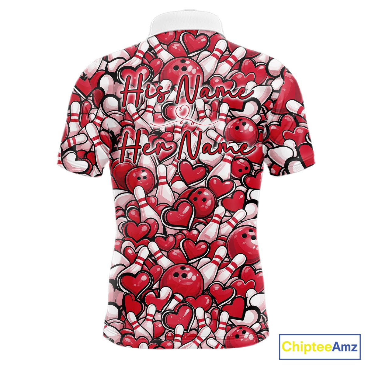 Custom Red Heart Theme Valentine Bowling Couple Shirt, Love Bowling Jerseys With His Name And Her Name IPHW10477