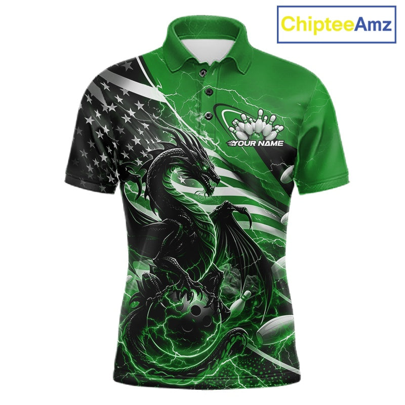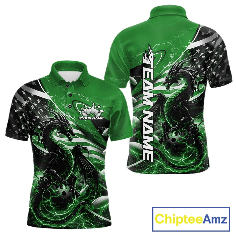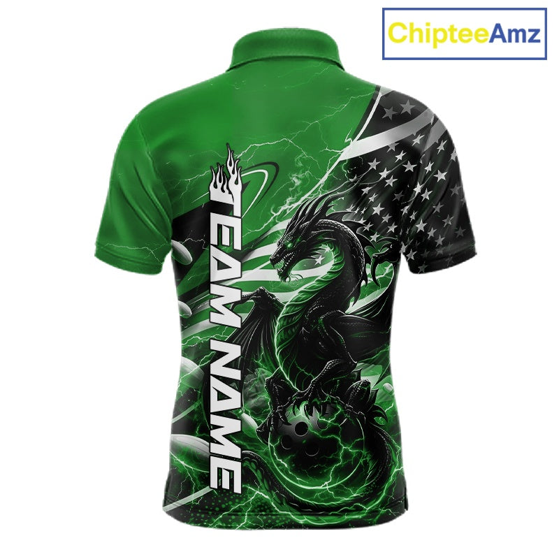 Custom Green Thunder Lightning Patriotic Dragon Bowling Shirts, Freedom US Flag Bowling Jerseys Bowlers Outfit IPHW10484